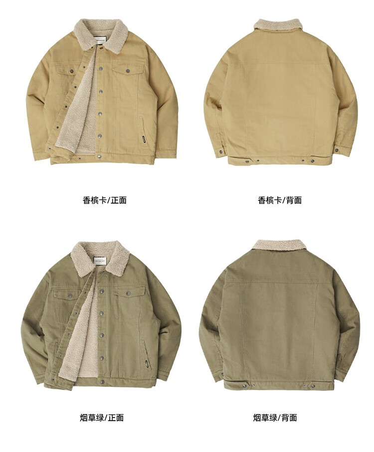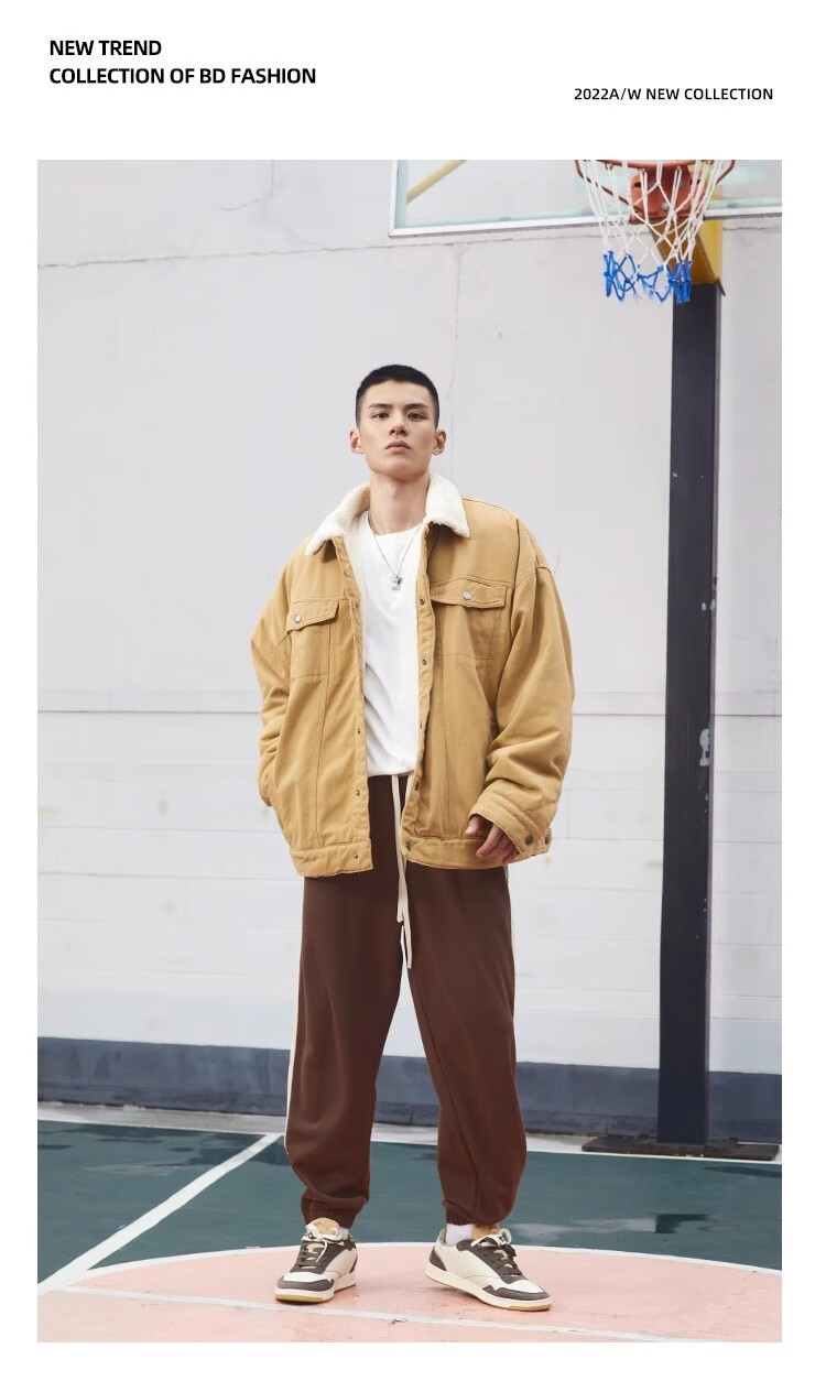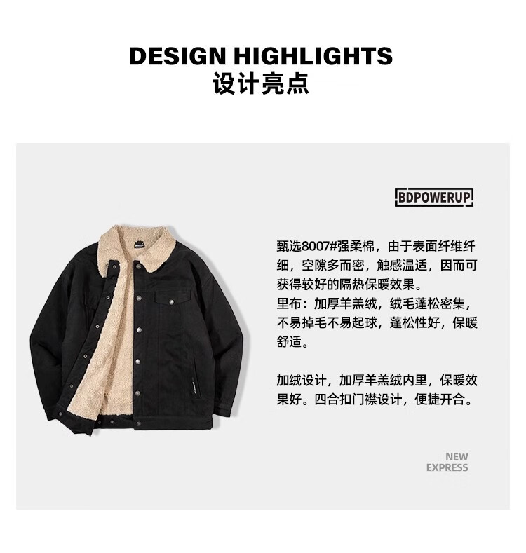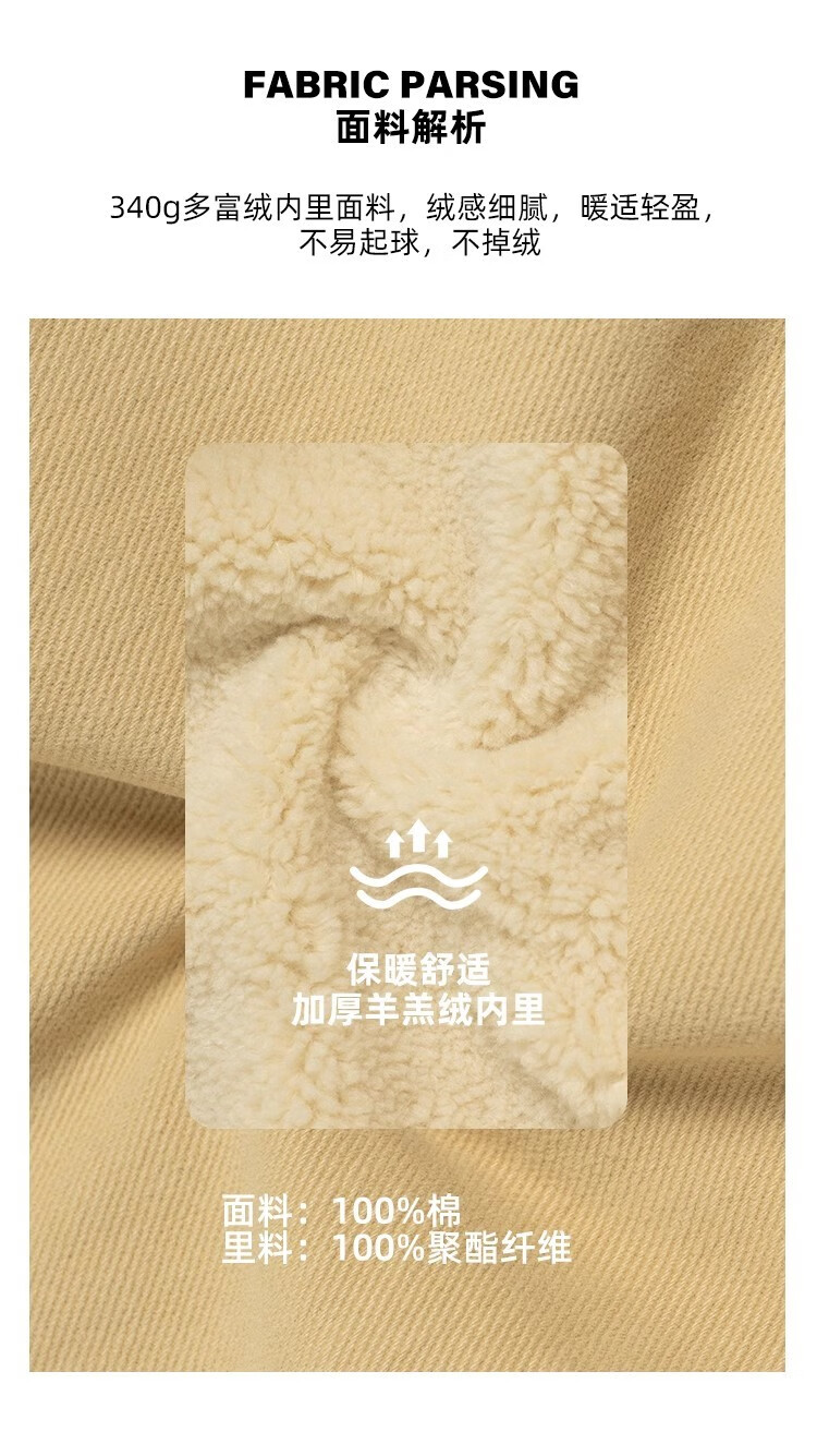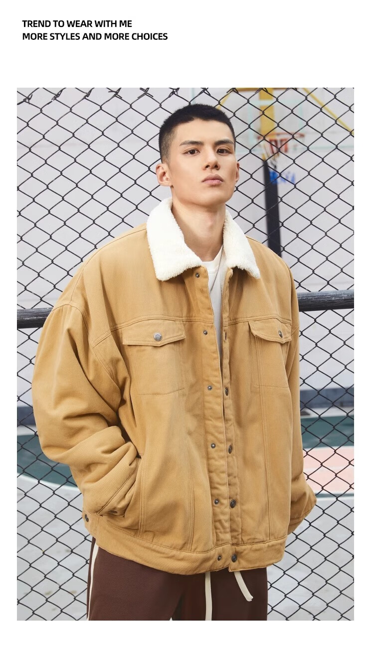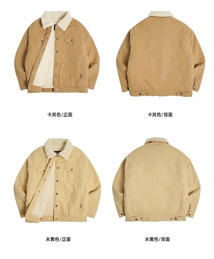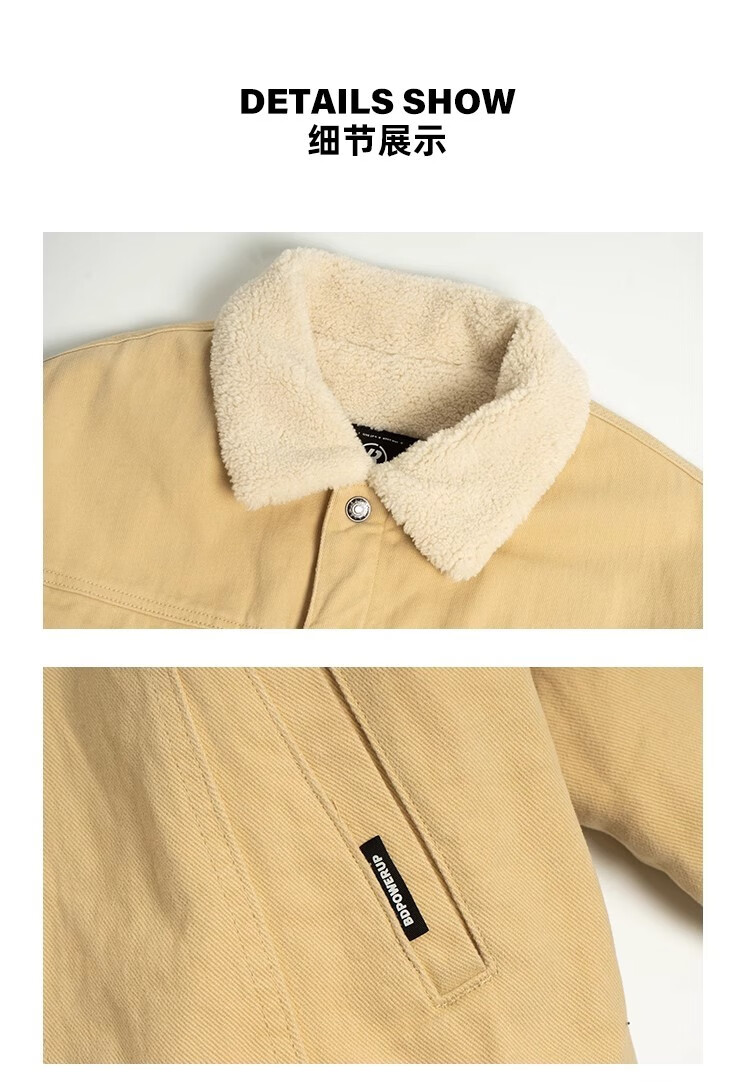 BD.POWER UP+秋冬黑色运动夹克巴恩风外套男加厚保暖羊羔绒外套男宽松翻领上衣 卡其色 L 150-170斤