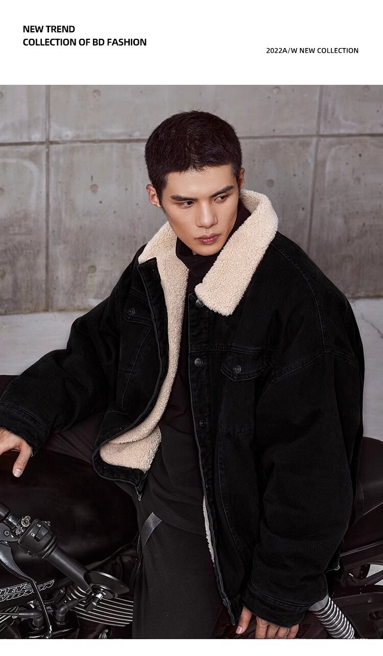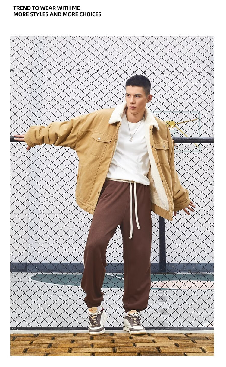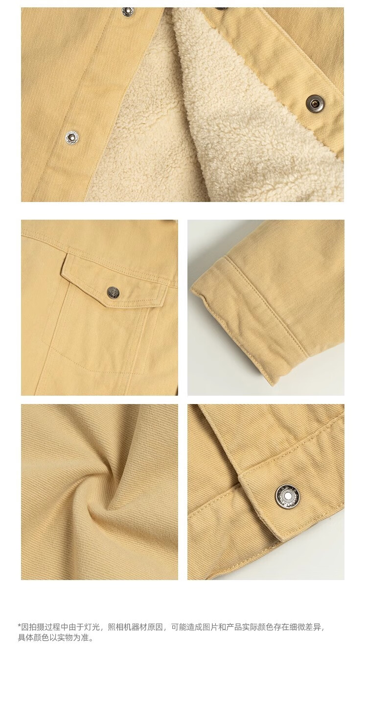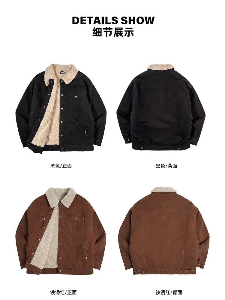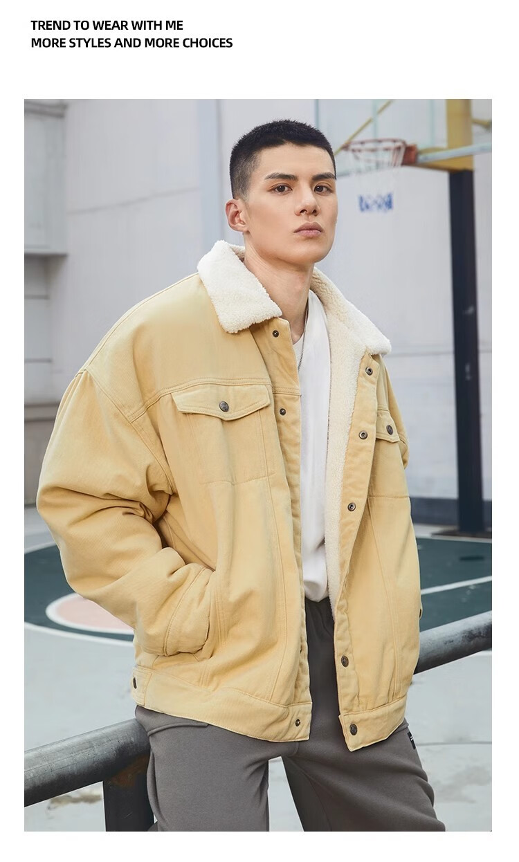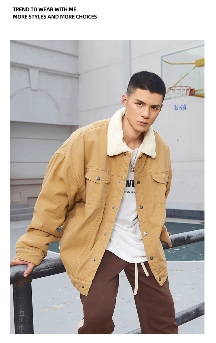 BD.POWER UP+秋冬黑色运动夹克巴恩风外套男加厚保暖羊羔绒外套男宽松翻领上衣 卡其色 L 150-170斤