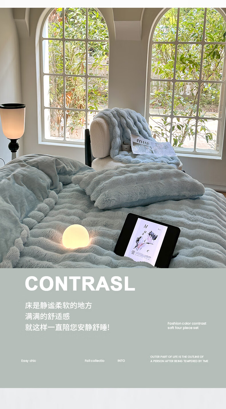 猫人(MiiOW)冬季牛奶绒被套单件双面加绒被罩珊瑚绒被单150*200*230cm单双人 灰+香槟【高克重双面牛奶绒 蓄热保暖 不易掉毛】 1.5m床笠四件套-适合200x230cm被芯