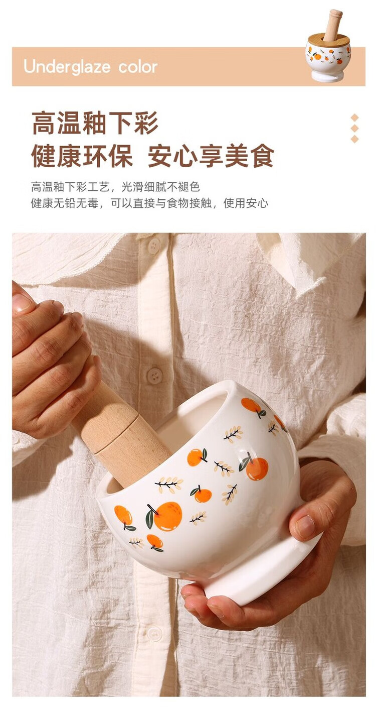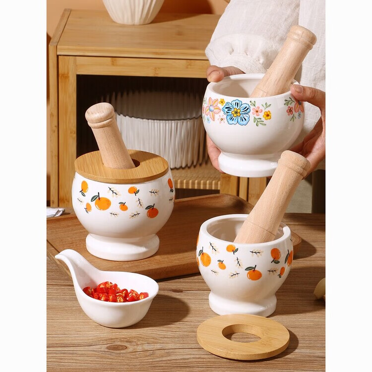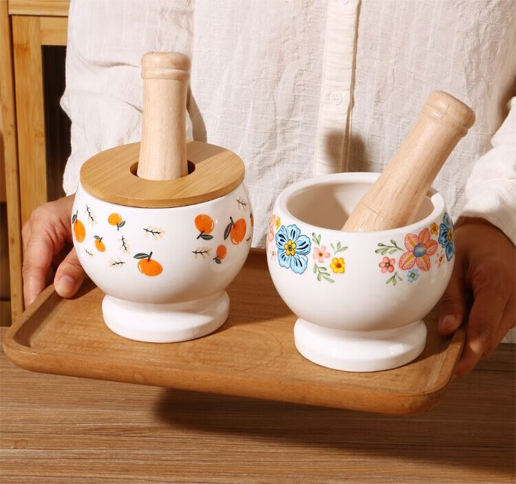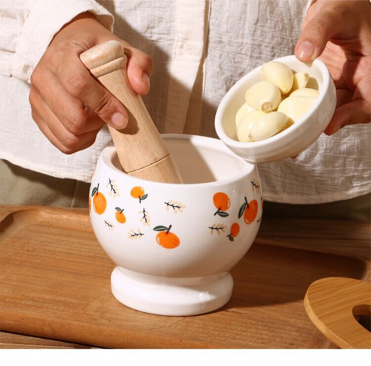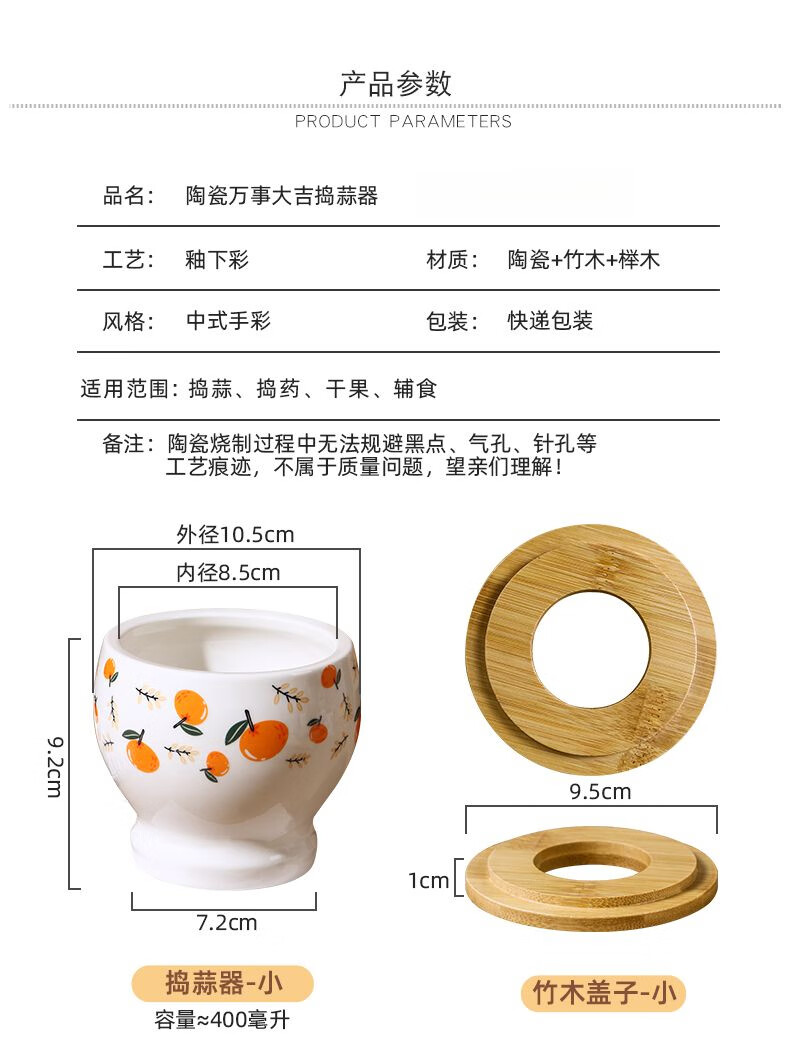 GIOIO捣蒜专用复古加厚蒜臼子手压式带盖捣碎器商用带盖螺纹研磨瓷罐子 万事大吉【捣蒜器-400ml】+榉木棒
