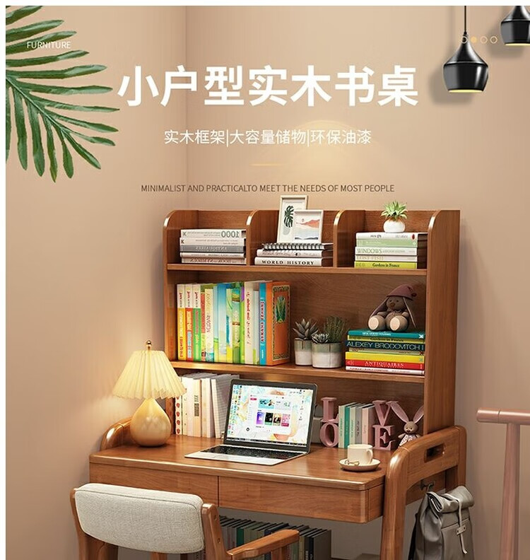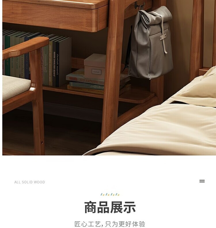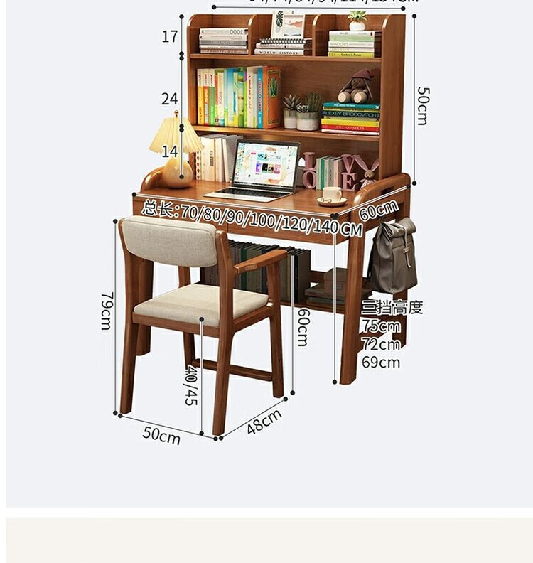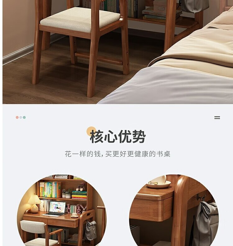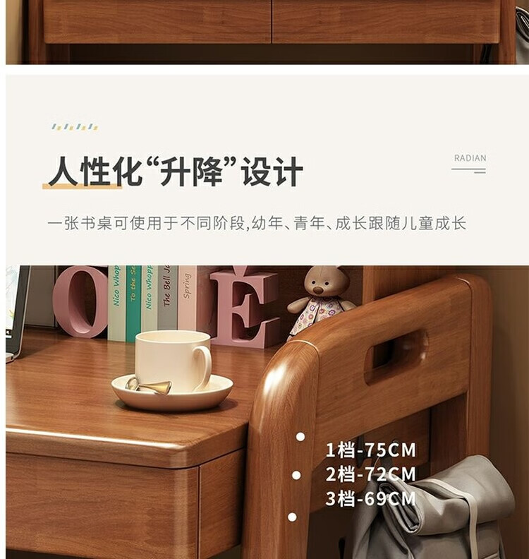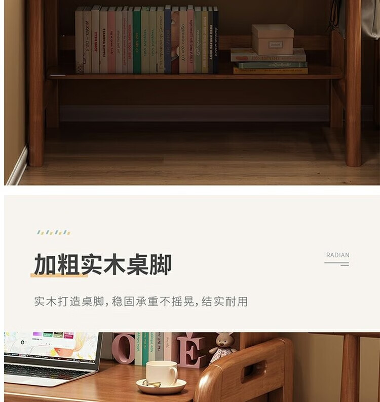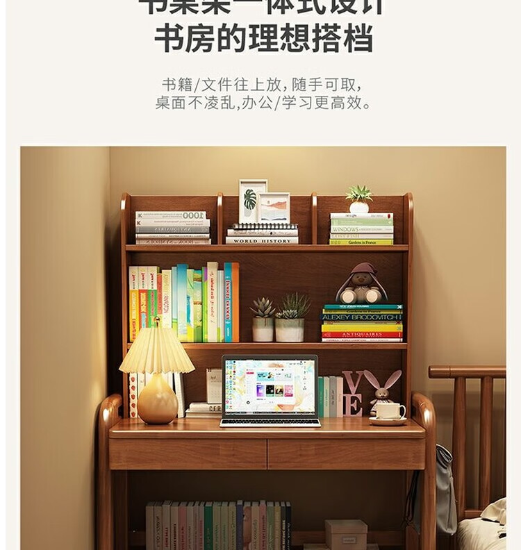 弘星隆实木书桌书架一体桌家用卧室中小学生可升降写字桌女孩儿童学习桌 胡桃色实木单桌 【桌面可三档升降】 70x60x125cm