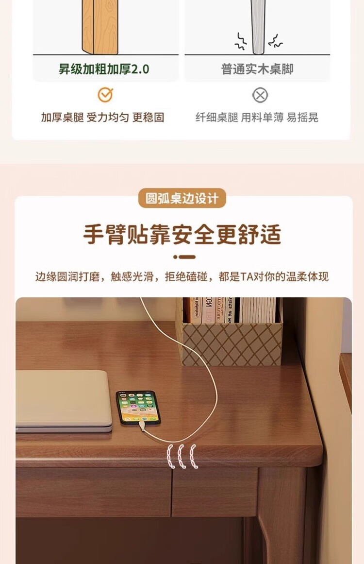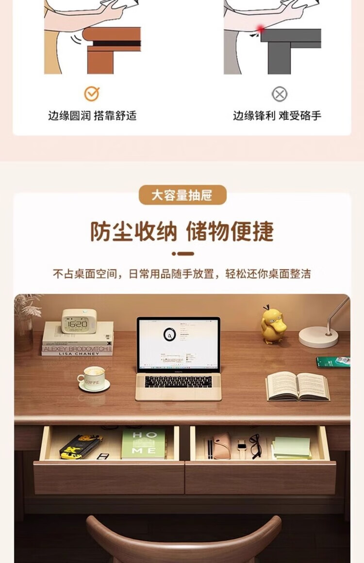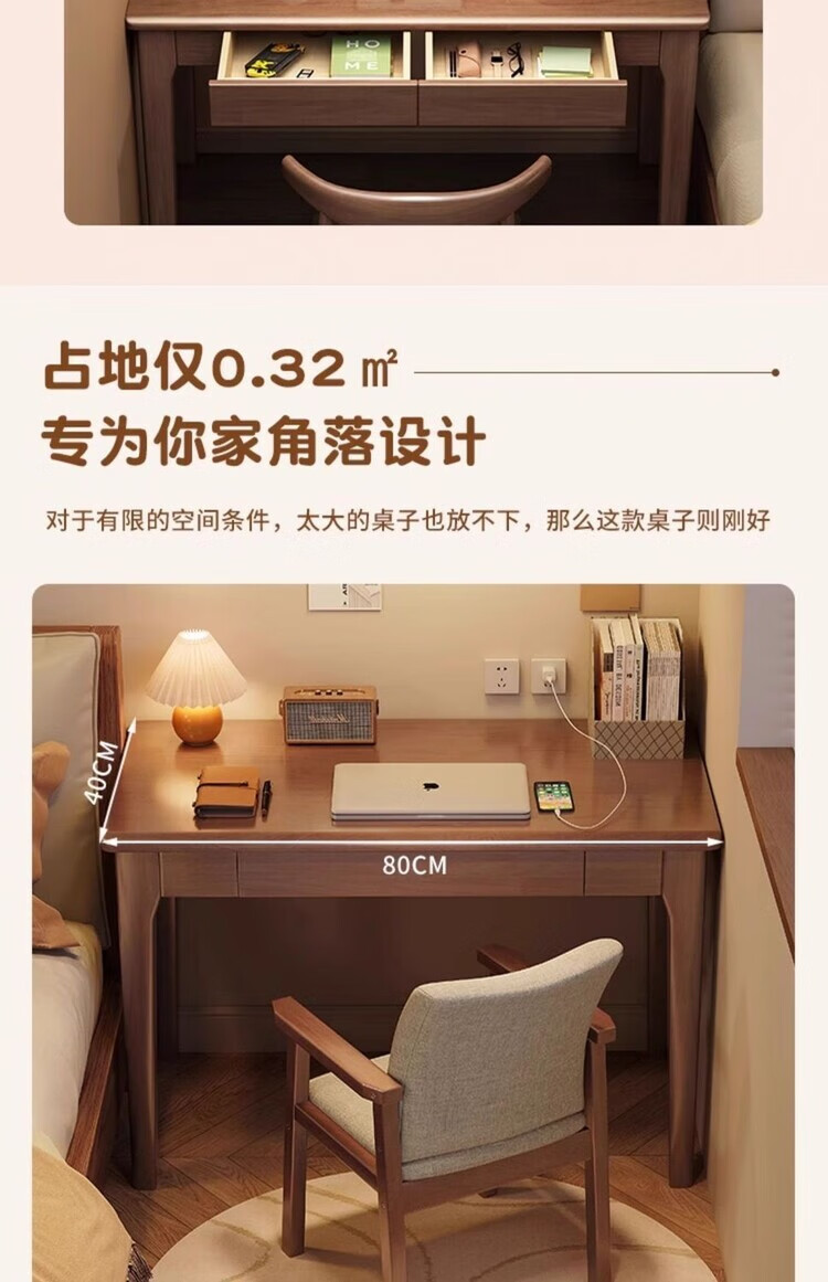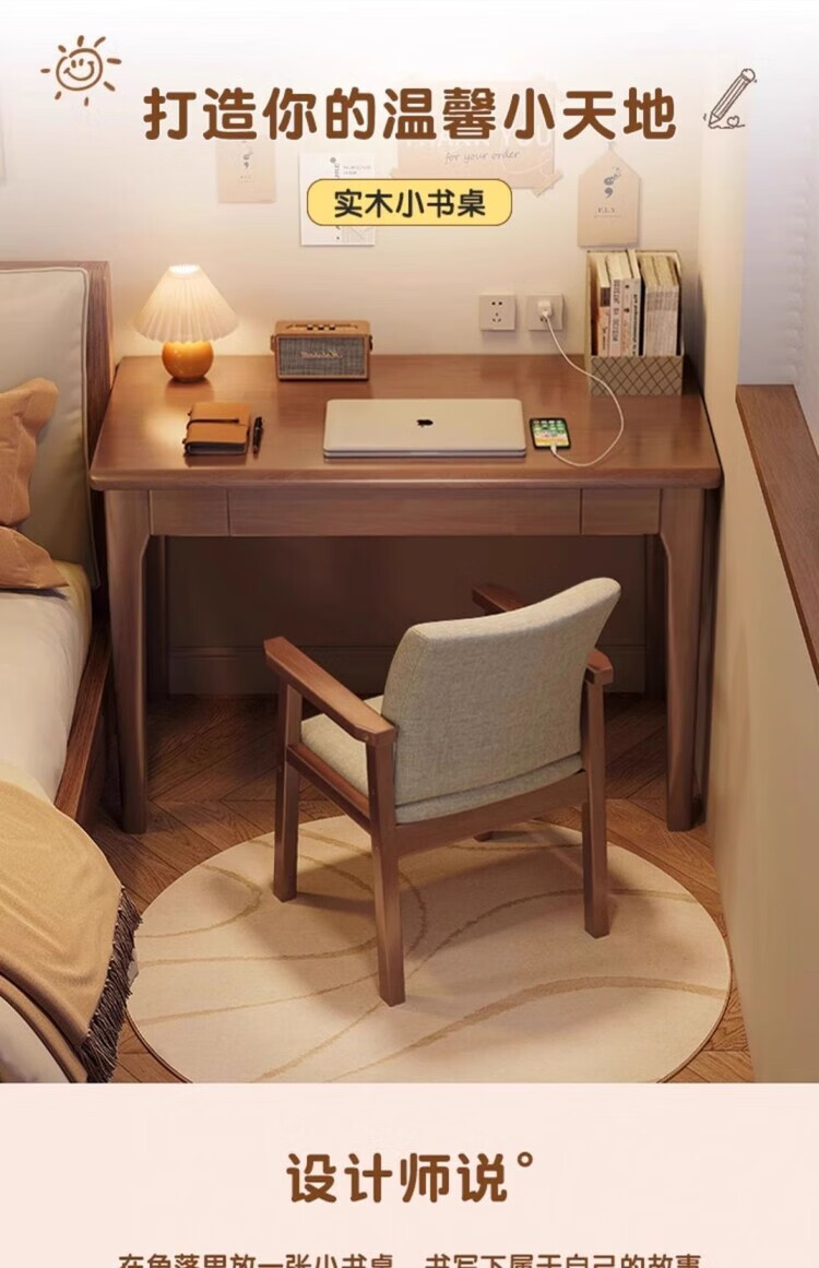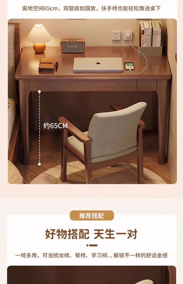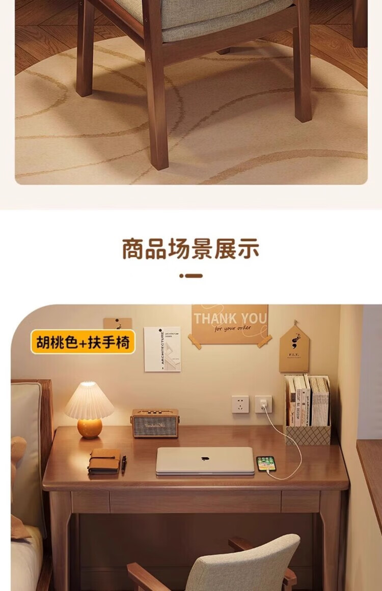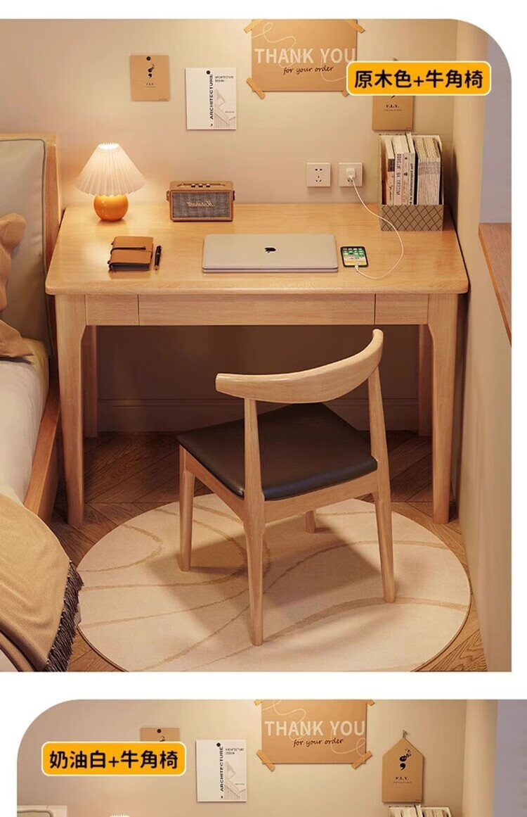迈途森全实木书桌卧室学生学习桌小户型办公桌家用电脑桌简约书房写字桌 原木色加厚单桌+A1靠背椅 长140+宽60X高75厘米【双抽屉款】