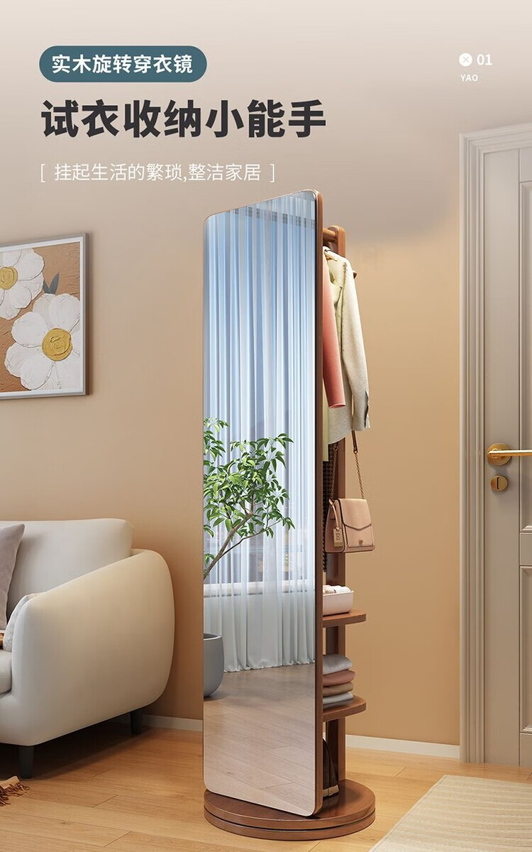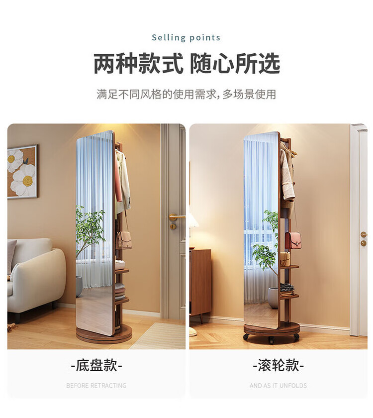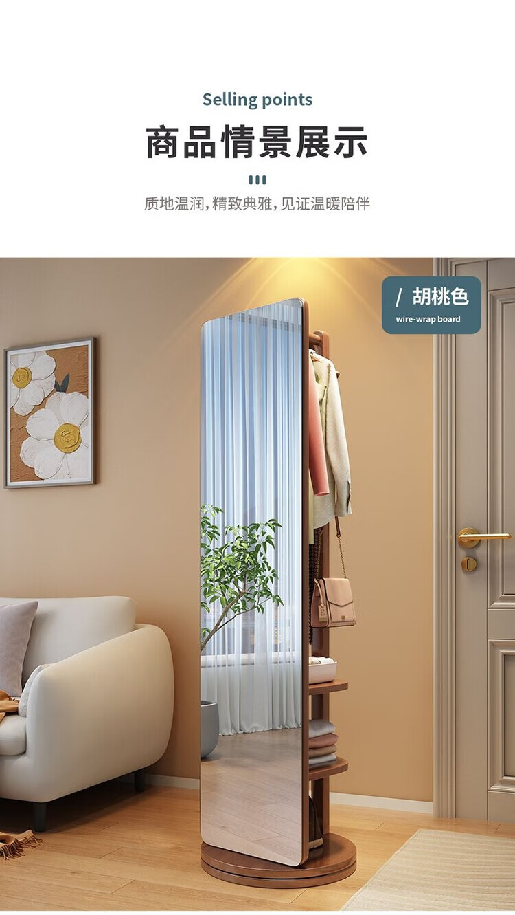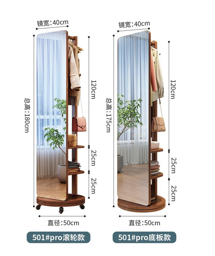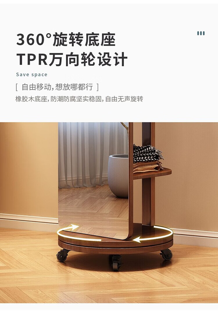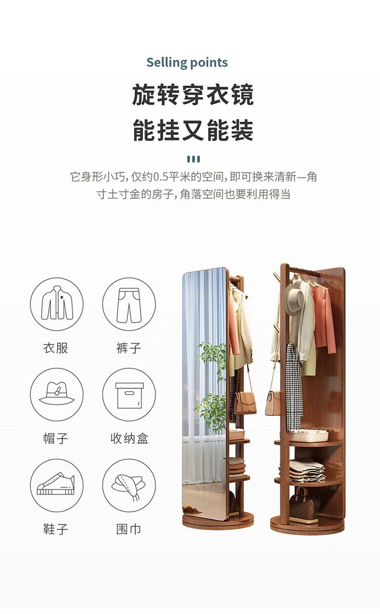 弘星隆实木穿衣镜家用可旋转落地镜卧室一体全身镜简约衣服收纳架 胡桃色 501底盘款(普通款)