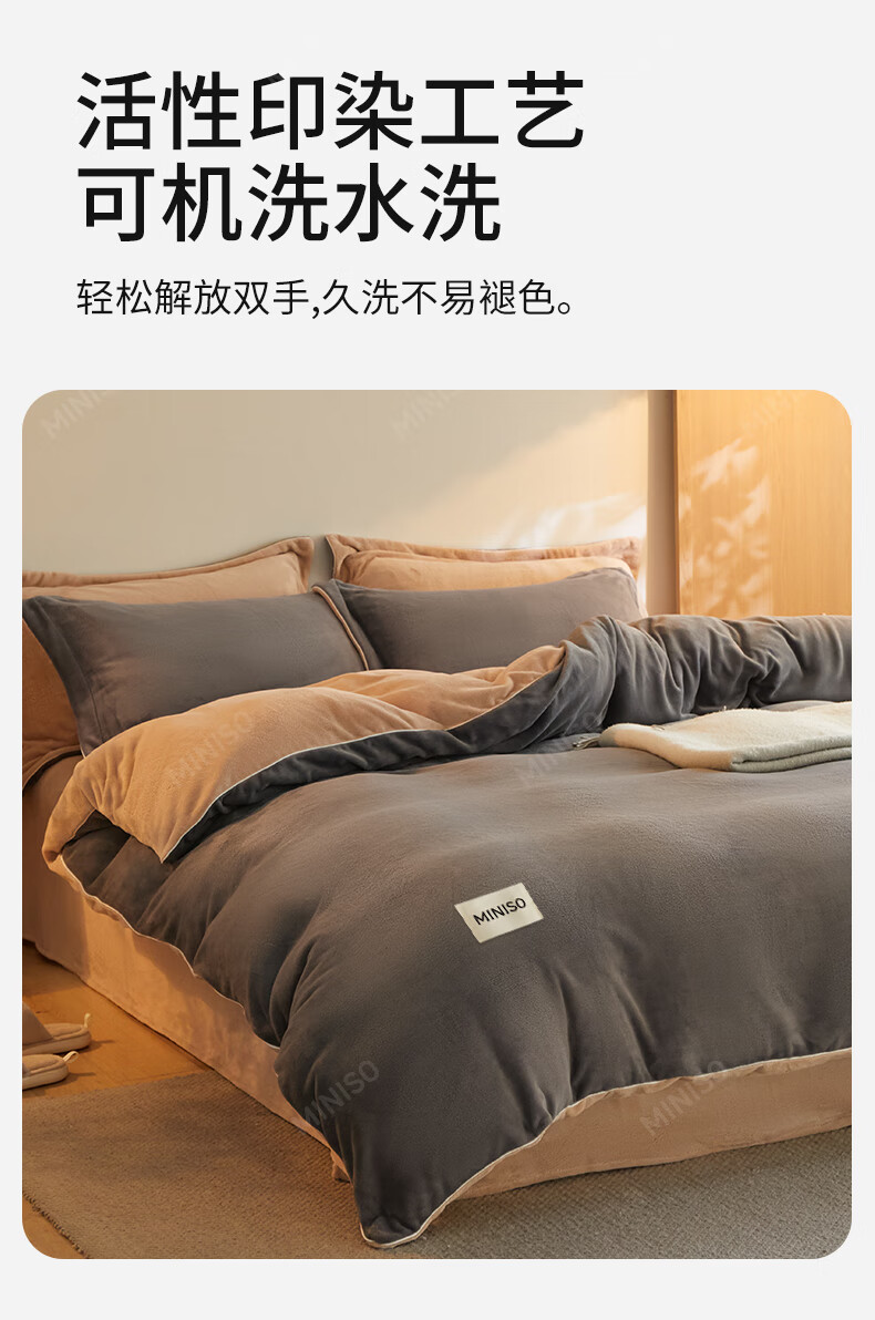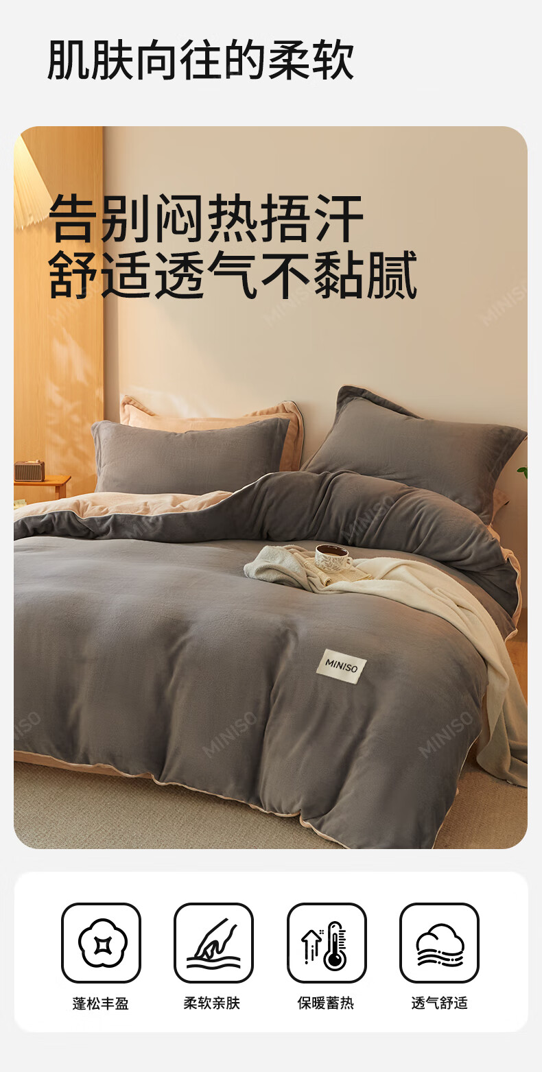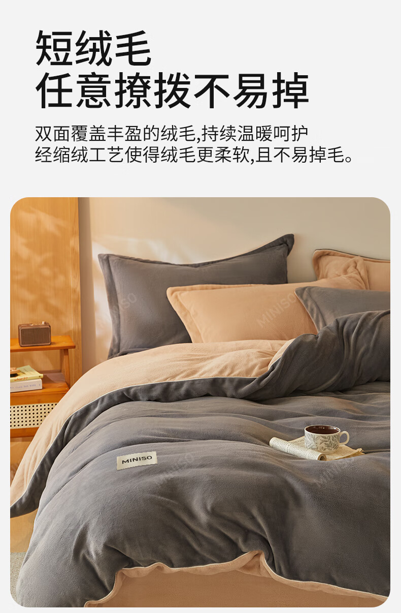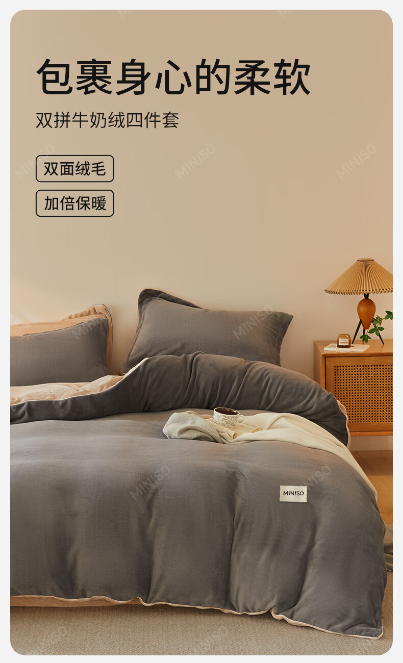名创优品牛奶绒床上四件套 冬季加厚保暖被套罩床单床笠单双人床品三件套 MINISO-深灰+卡其 1.5/1.8 床单款 四件套(被套2.0*2.3m)