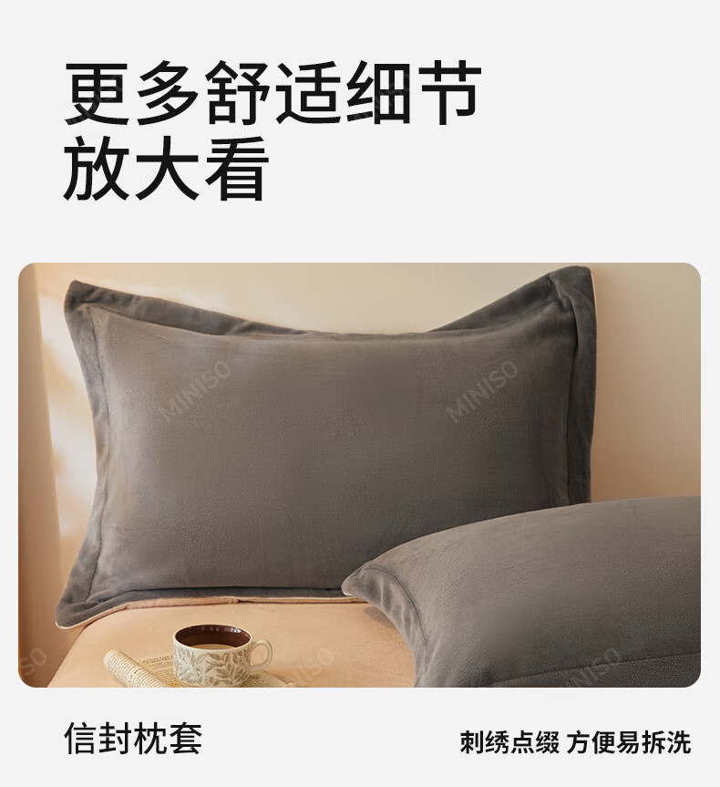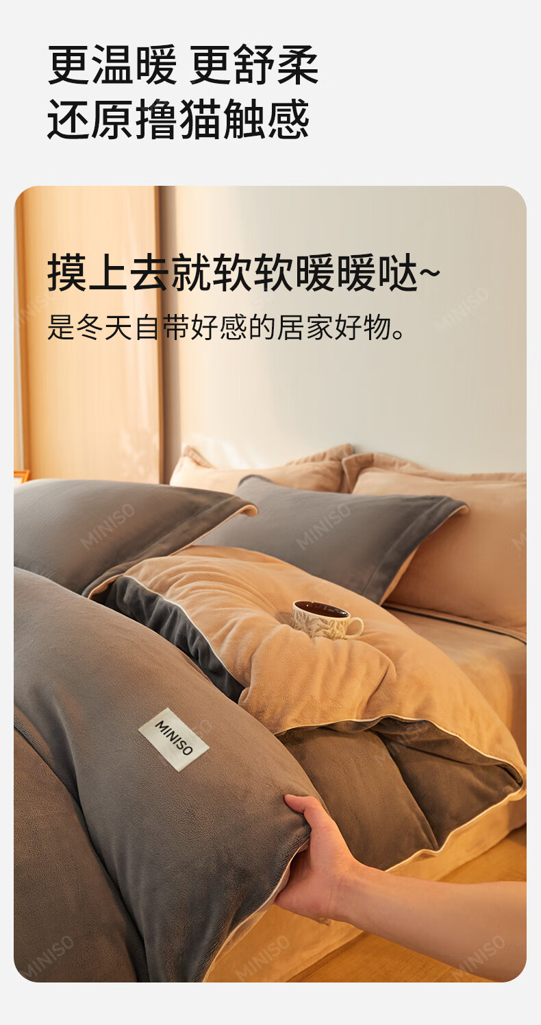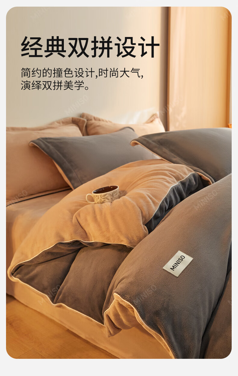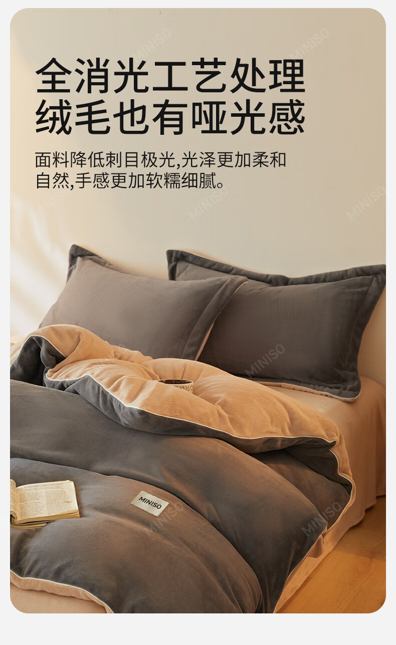 名创优品牛奶绒床上四件套 冬季加厚保暖被套罩床单床笠单双人床品三件套 MINISO-深灰+卡其 1.5/1.8 床单款 四件套(被套2.0*2.3m)