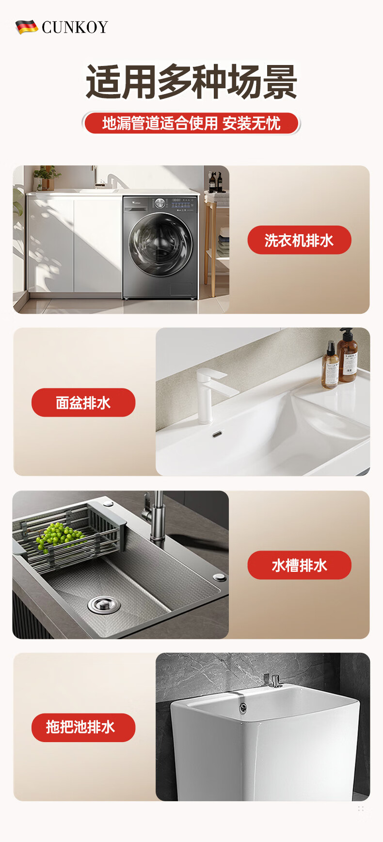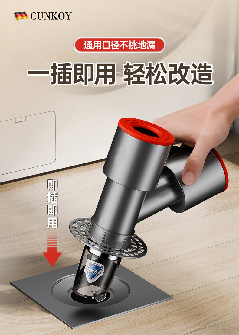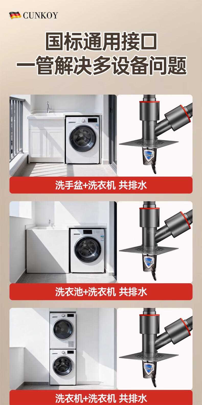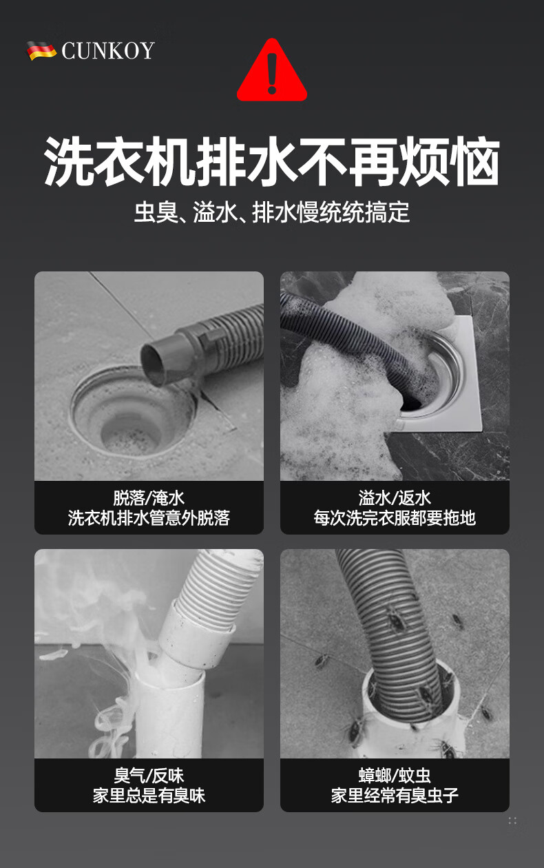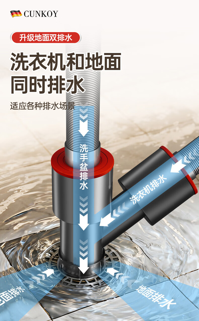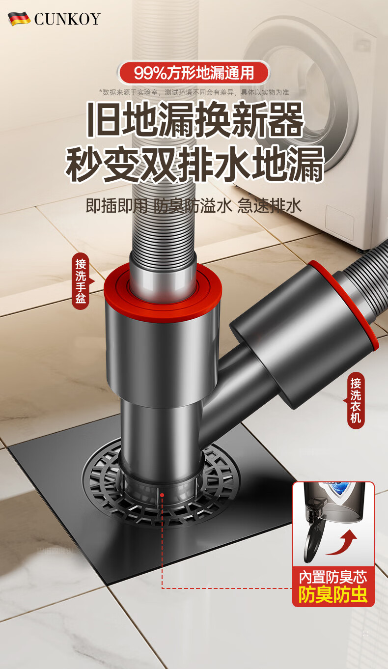 CUNKOY【德国】洗衣机下水三通下水管二合一地漏防臭排水管专用下水接头 斜三通防臭密封塞【枪灰】 防臭防溢水丨洗衣机+地面同时排水