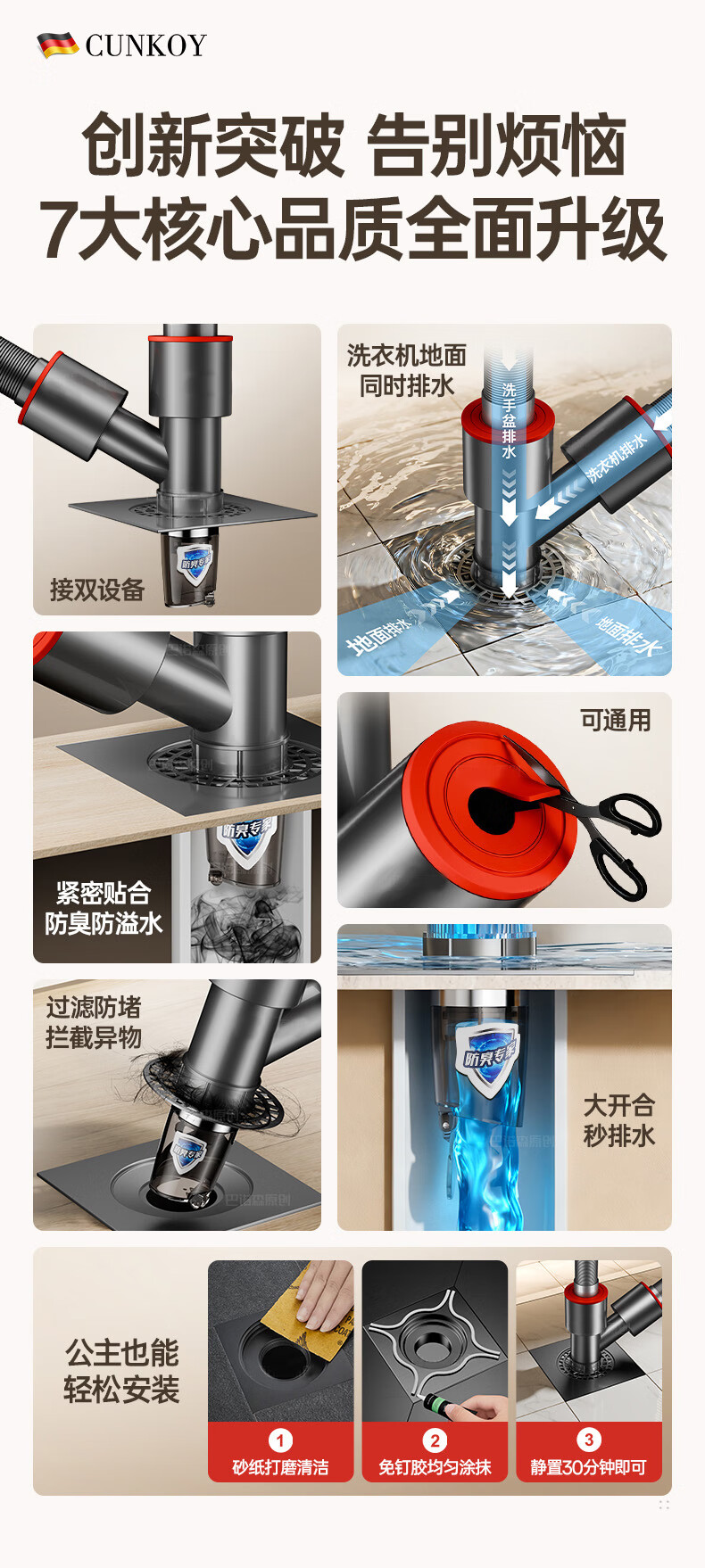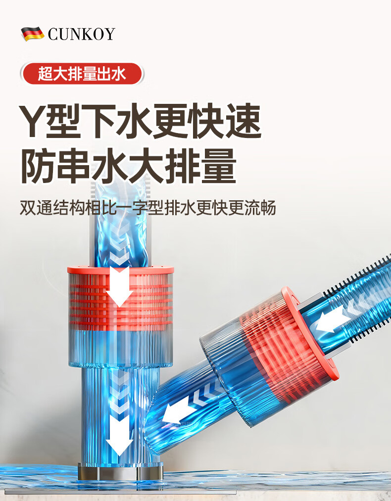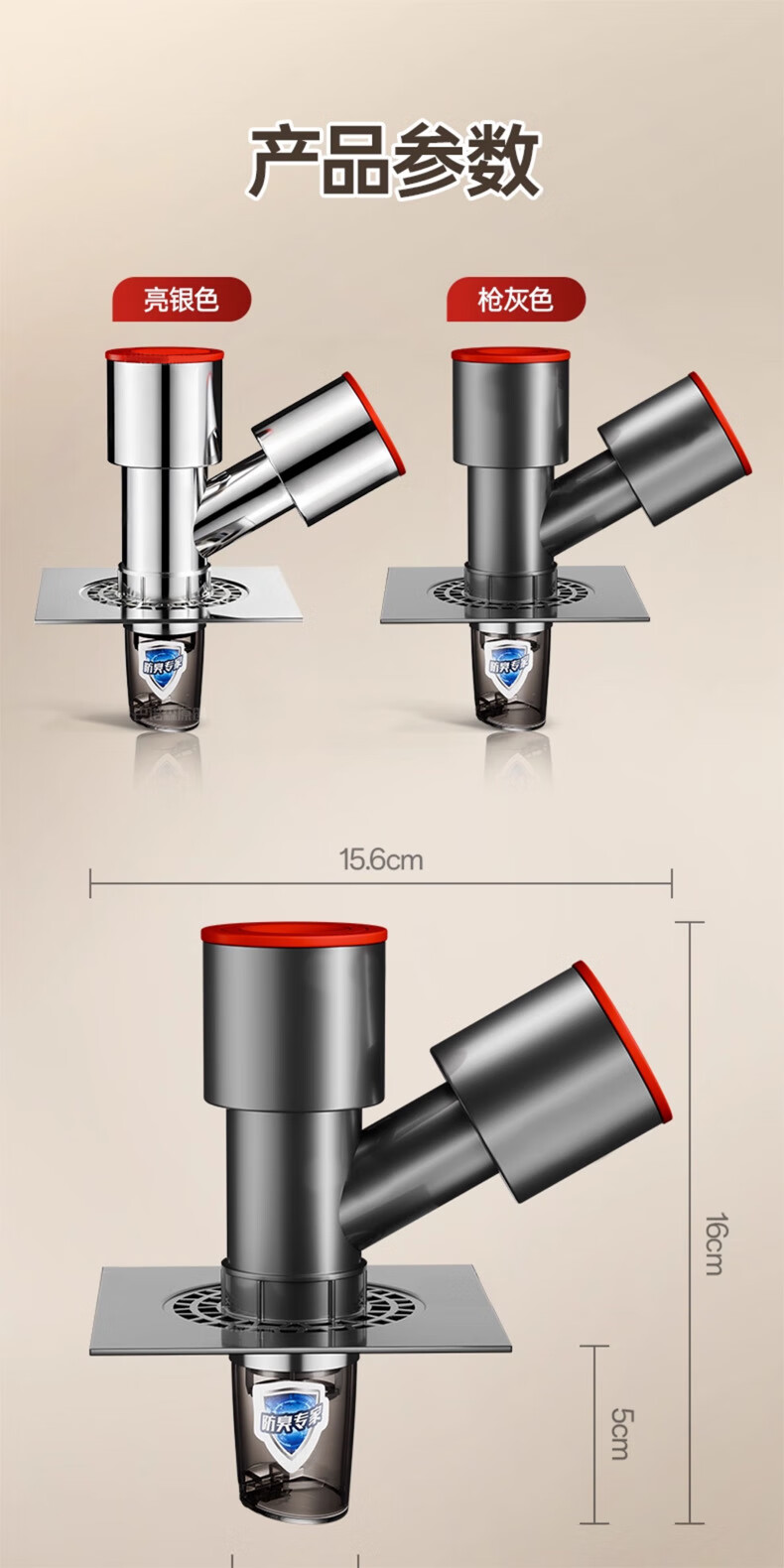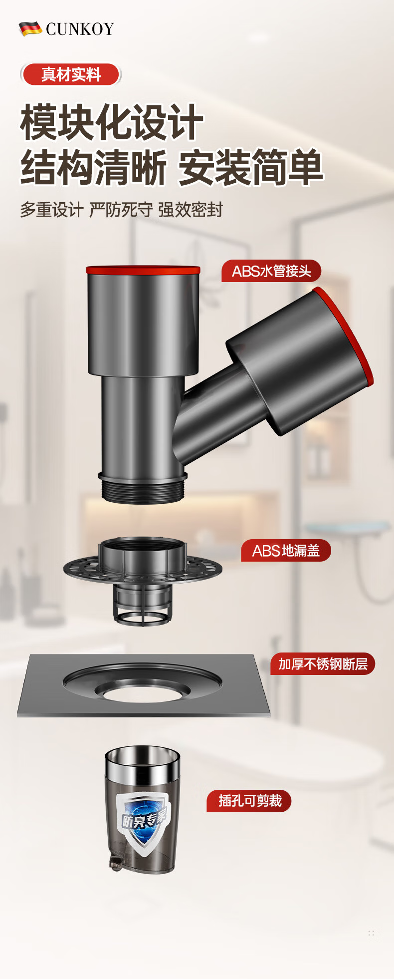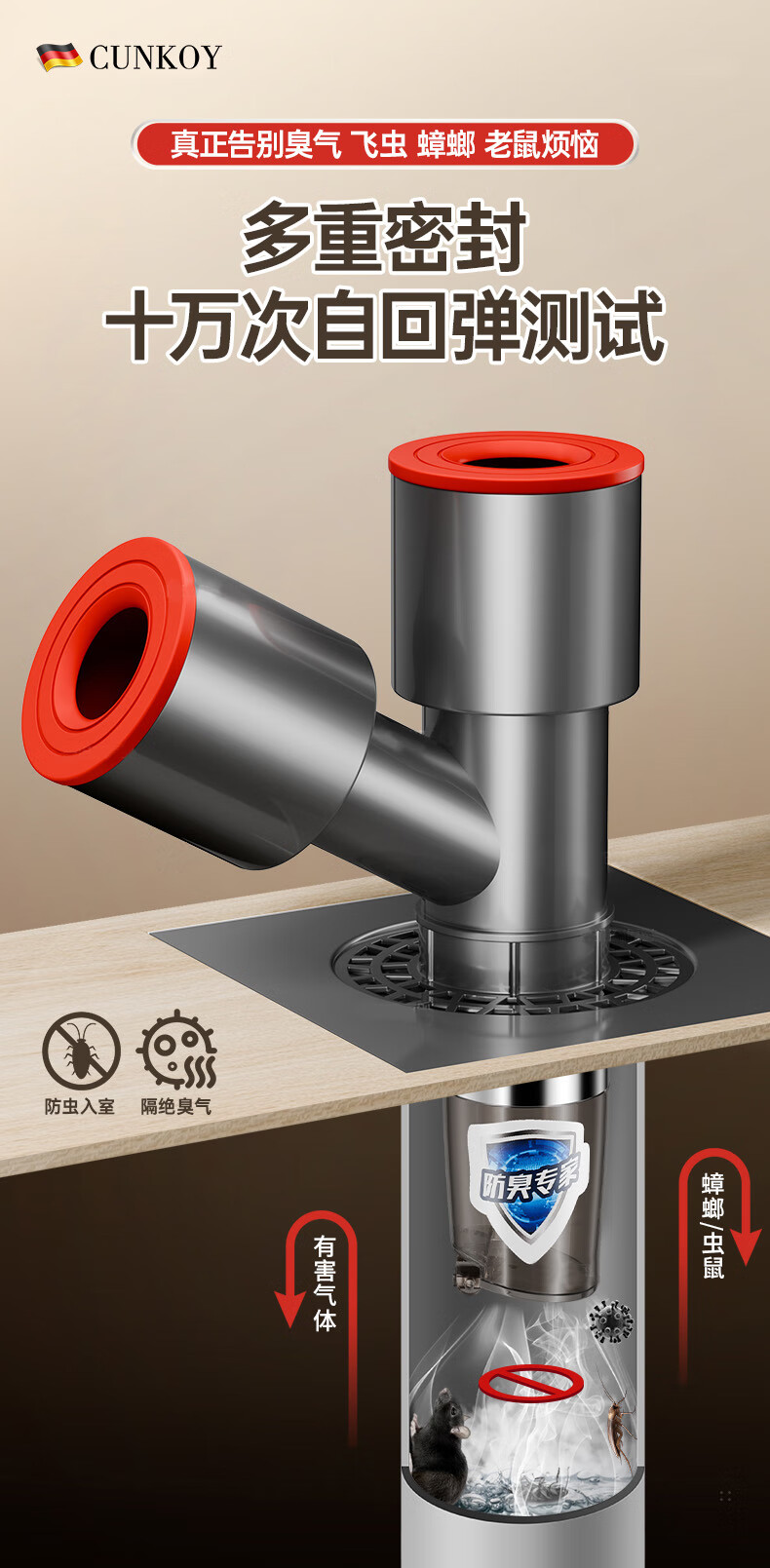 CUNKOY【德国】洗衣机下水三通下水管二合一地漏防臭排水管专用下水接头 斜三通防臭密封塞【枪灰】 防臭防溢水丨洗衣机+地面同时排水