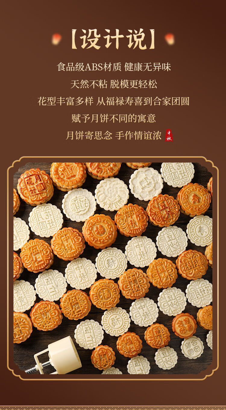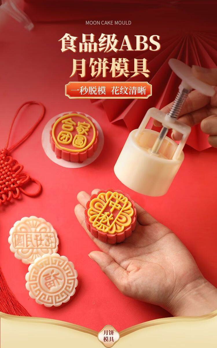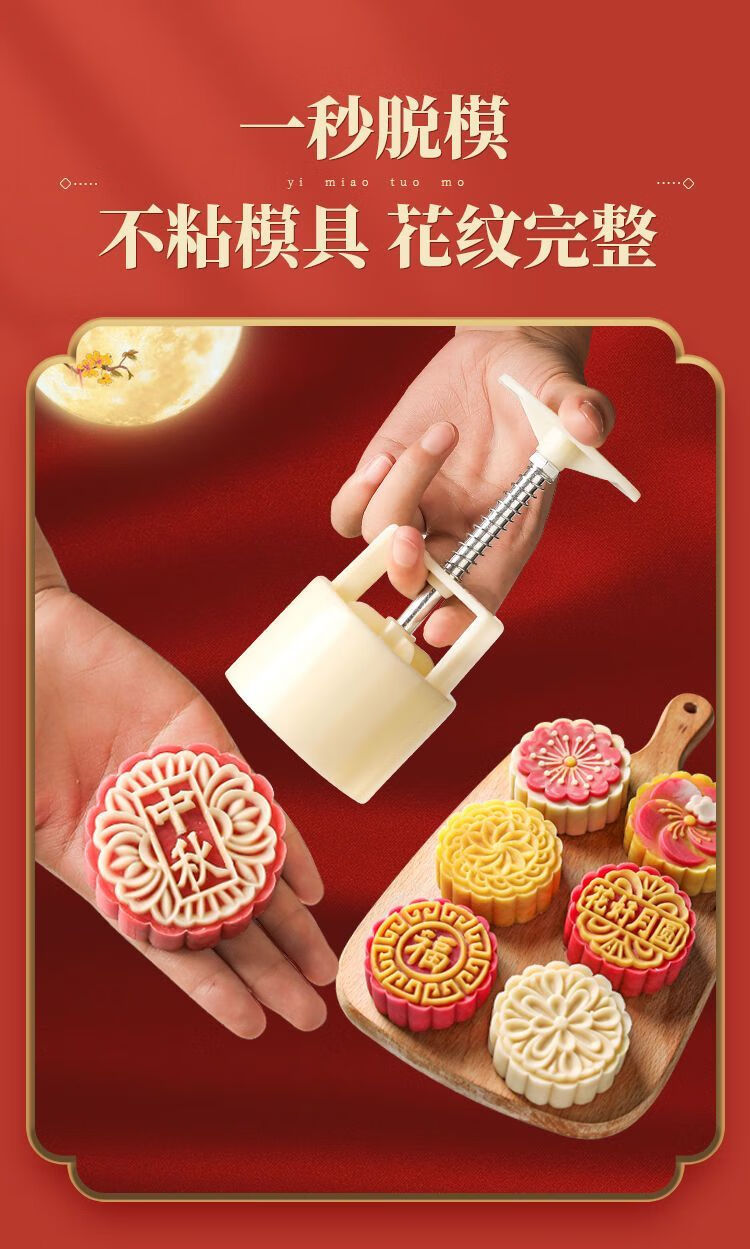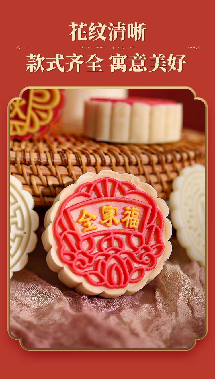 简漾2025新款月饼模具合家团圆花好月圆中秋家用绿豆糕点烘焙模型印具 50g中国风1模4底 送油刷