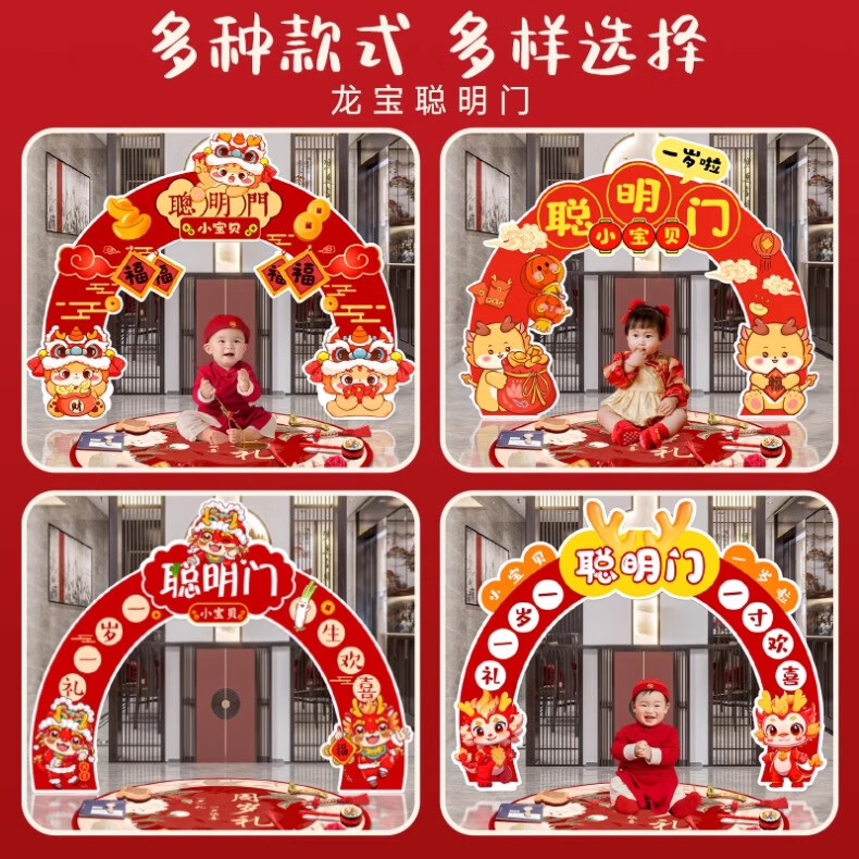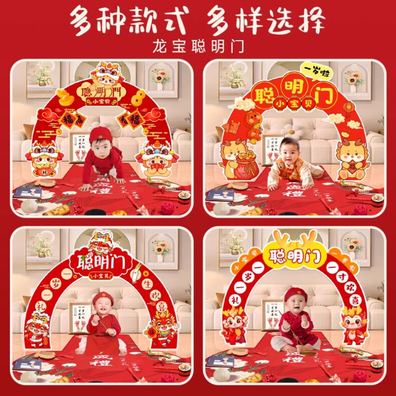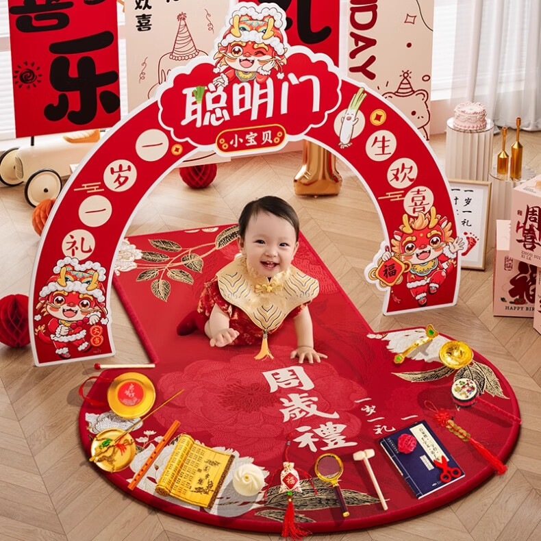 抓周龙宝宝一周岁生日布置聪明门男孩女宝抓周仪式用品道具过聪门布置 一岁一礼龙宝聪明门KT板 +国风一岁一礼T型毯+抓周18件