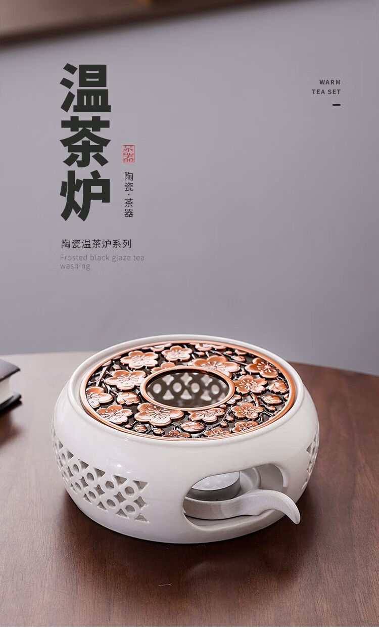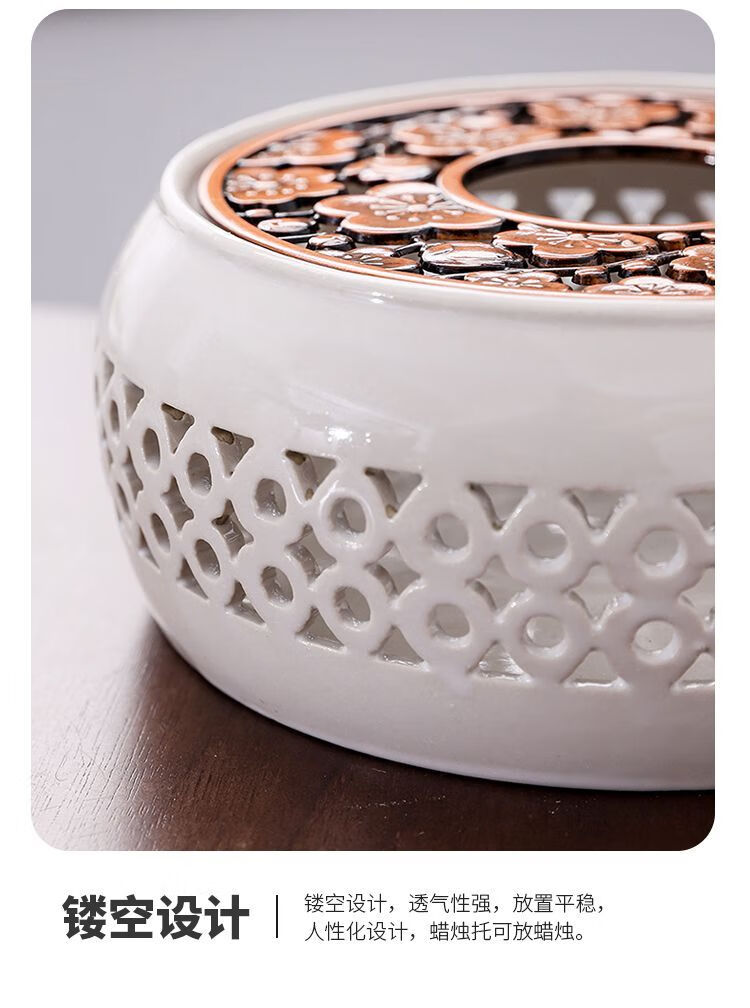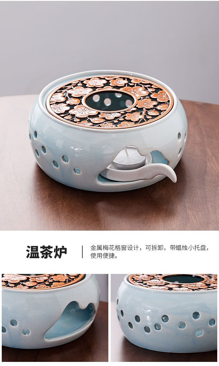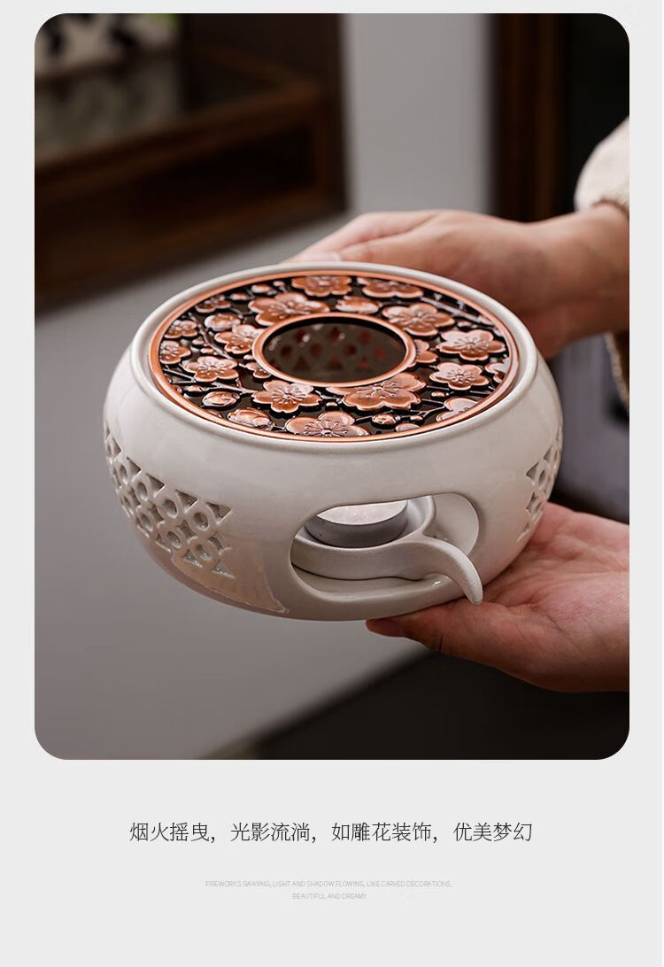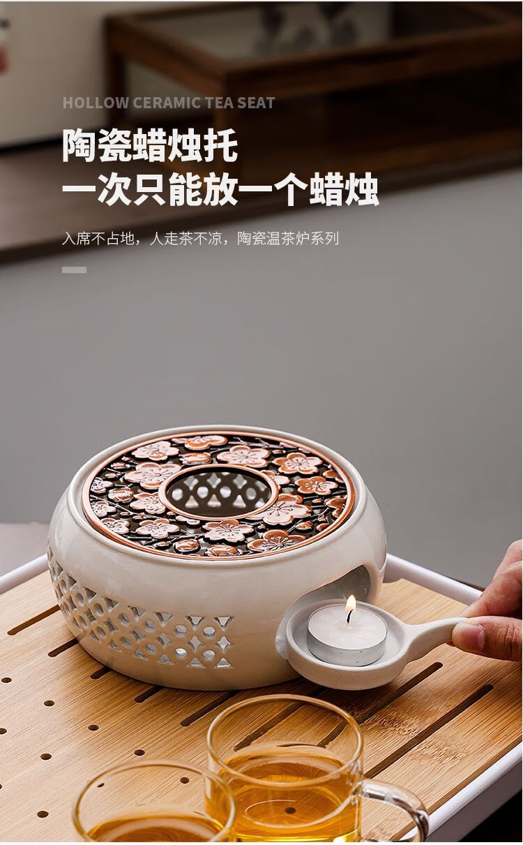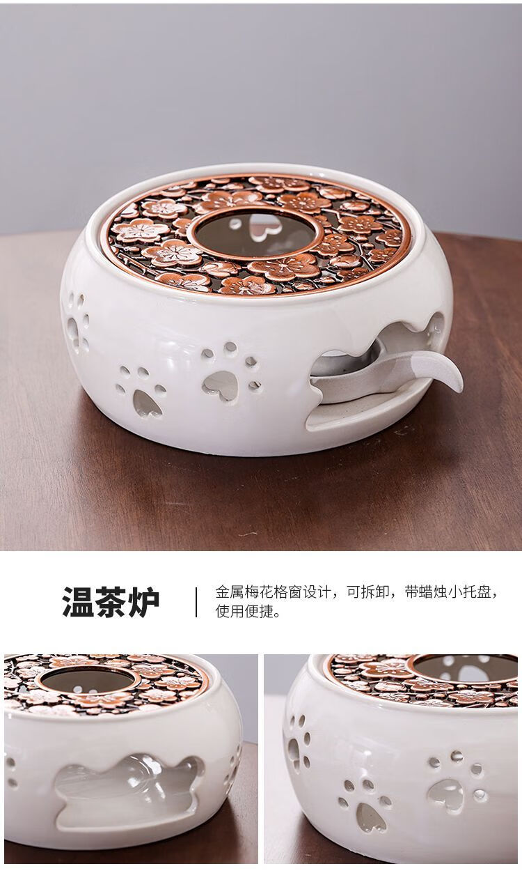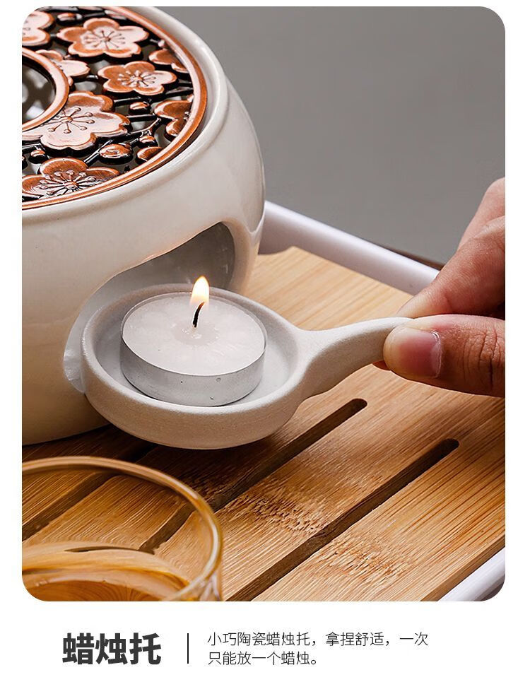 花沐禧暖茶陶瓷煮茶炉酒店餐厅必备半手工玲珑花茶壶蜡烛加热底座 缟羽白玲珑+梅花隔垫-【送烛托+蜡烛10枚】