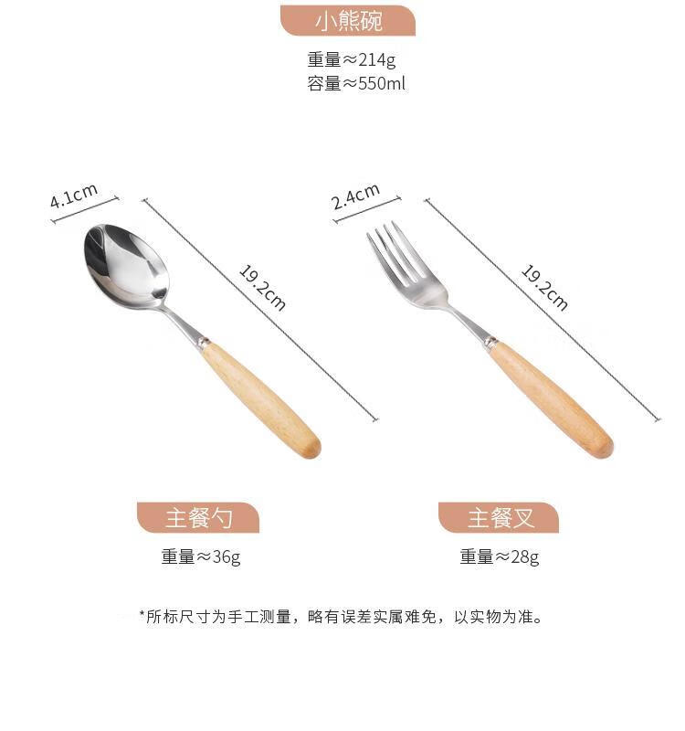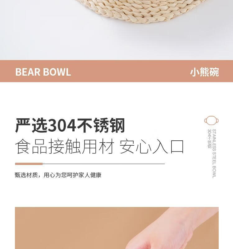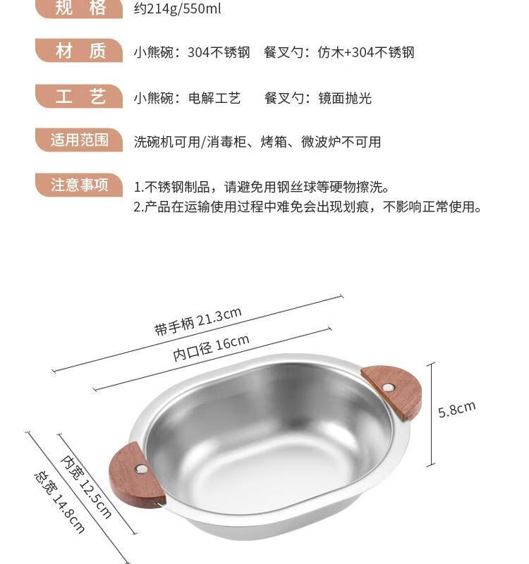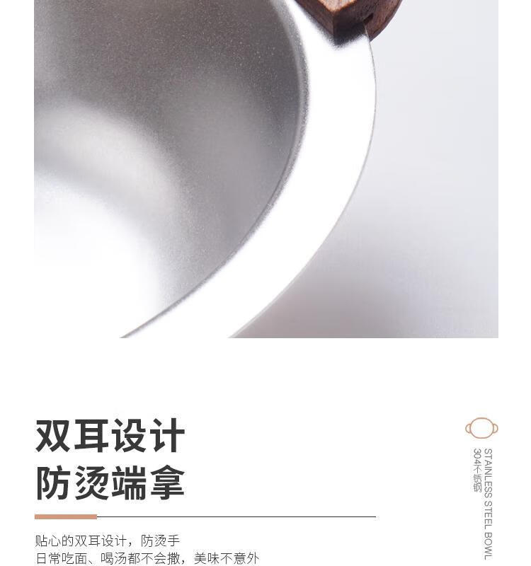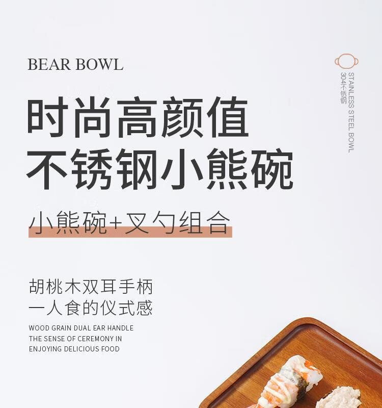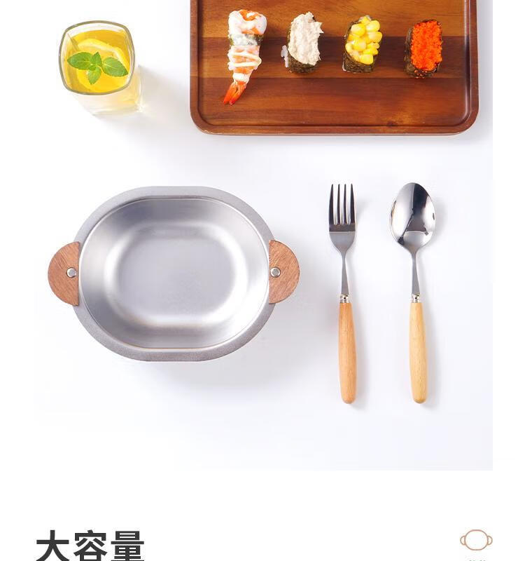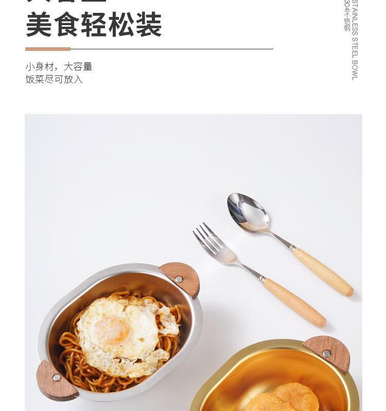 简漾加厚304不锈钢胡桃木双耳小熊碗ins防摔可爱儿童碗带柄防烫饭碗 本色 小号 19*14cm