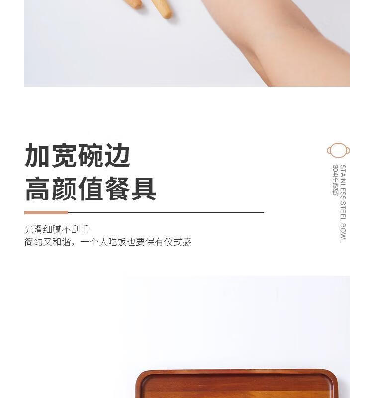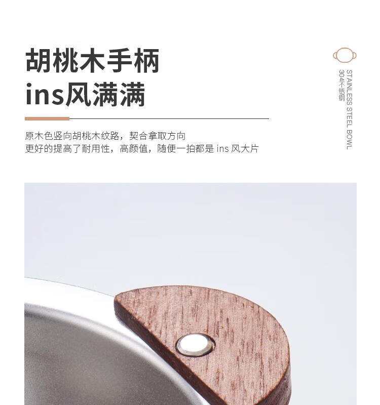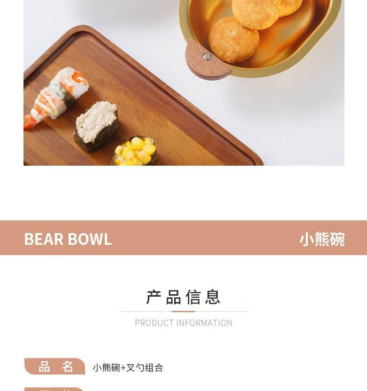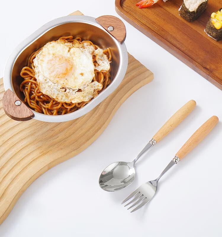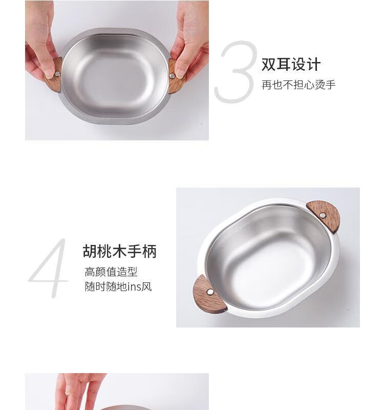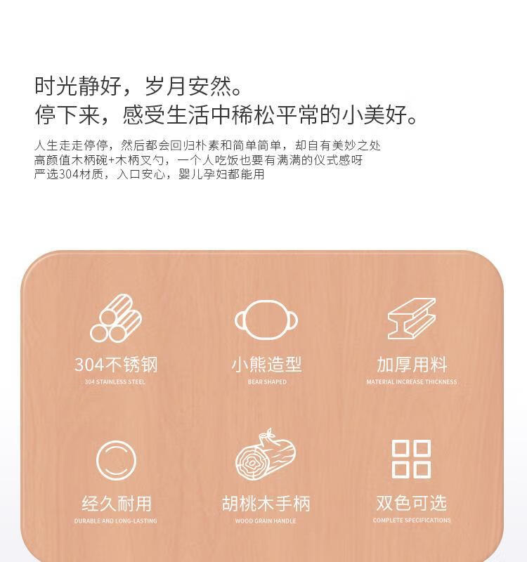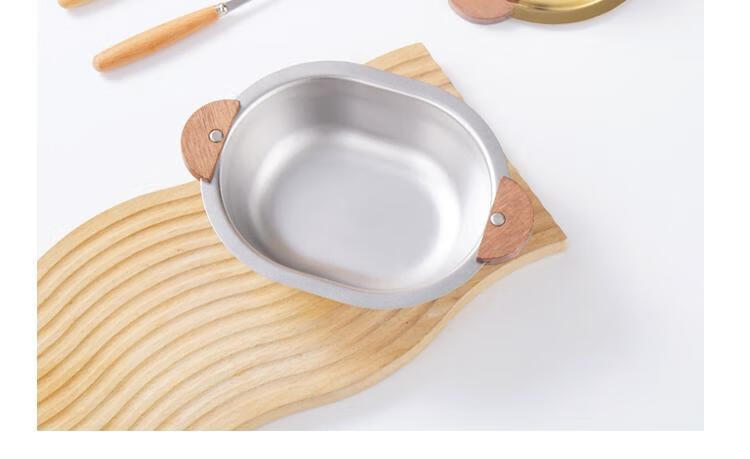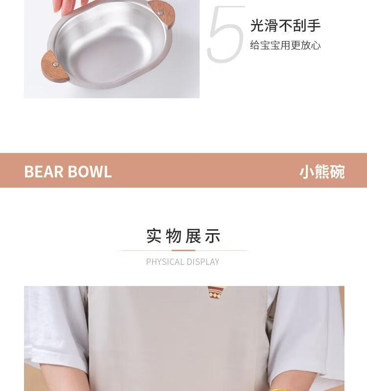 简漾加厚304不锈钢胡桃木双耳小熊碗ins防摔可爱儿童碗带柄防烫饭碗 本色 小号 19*14cm