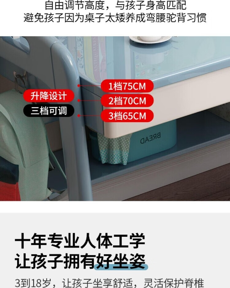 海诗圣堡免安装小学生家用书桌可升降儿童学习桌椅培训班写字桌学校课桌椅 学校同款单椅下单备注 颜色 长60x宽40x高76 cm