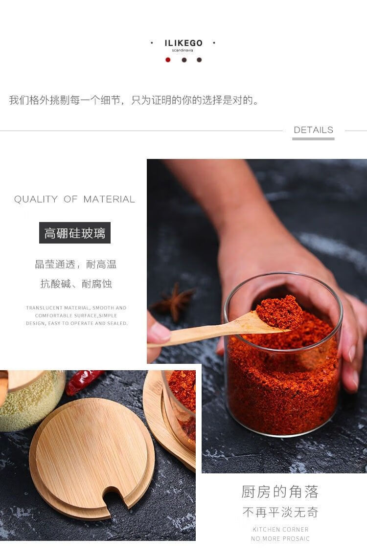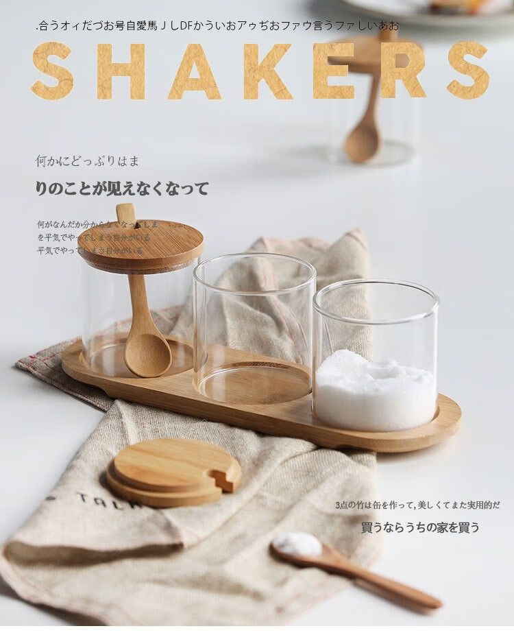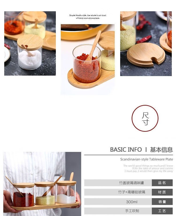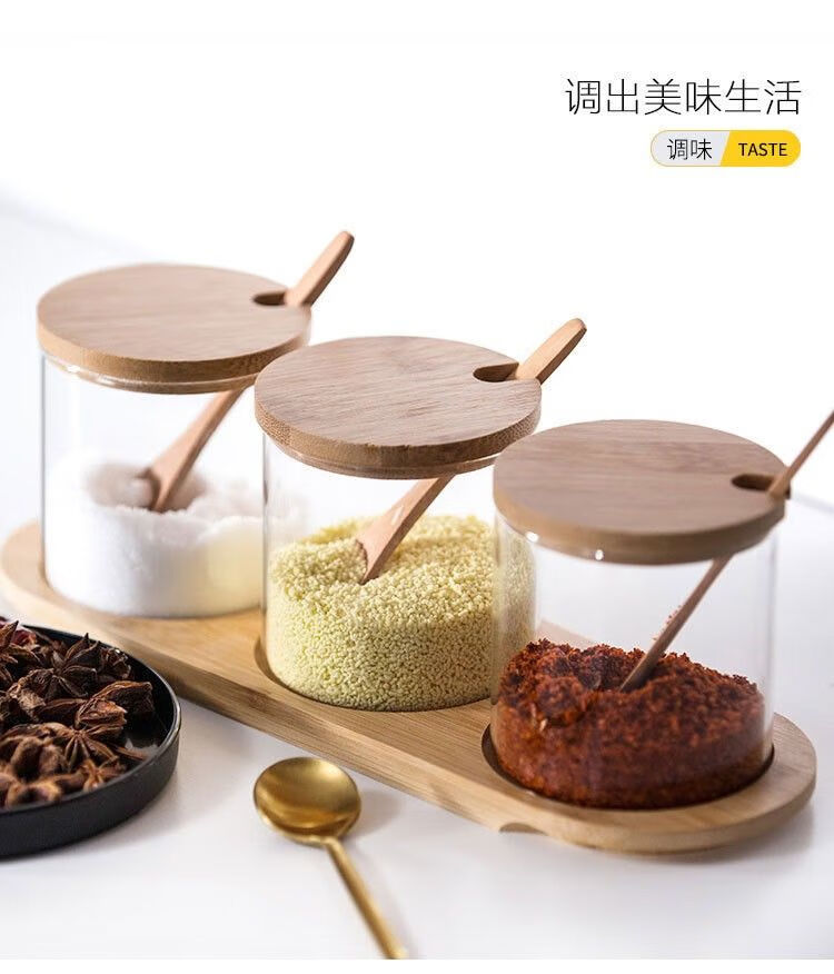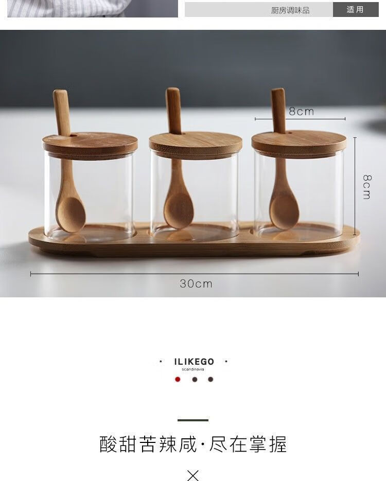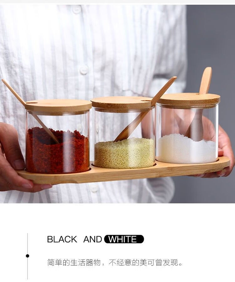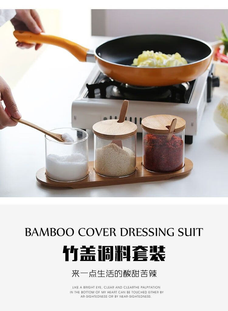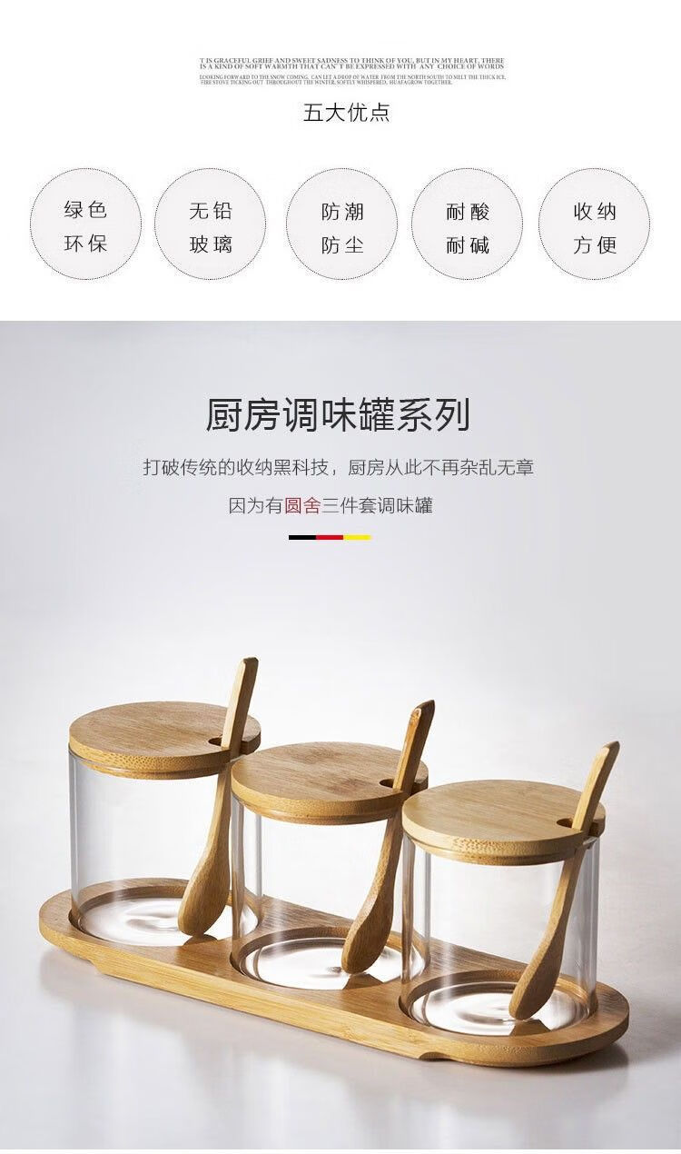GIOIO玻璃厨房调料防潮家用密封组合套装调味味精调味瓶收纳调味料盐罐 三件套(带方角竹托+竹盖+竹勺)