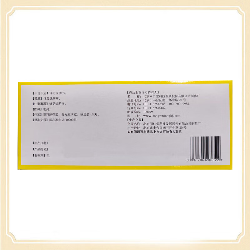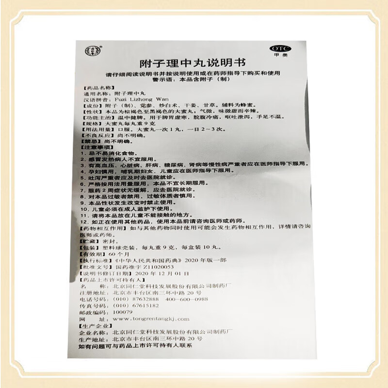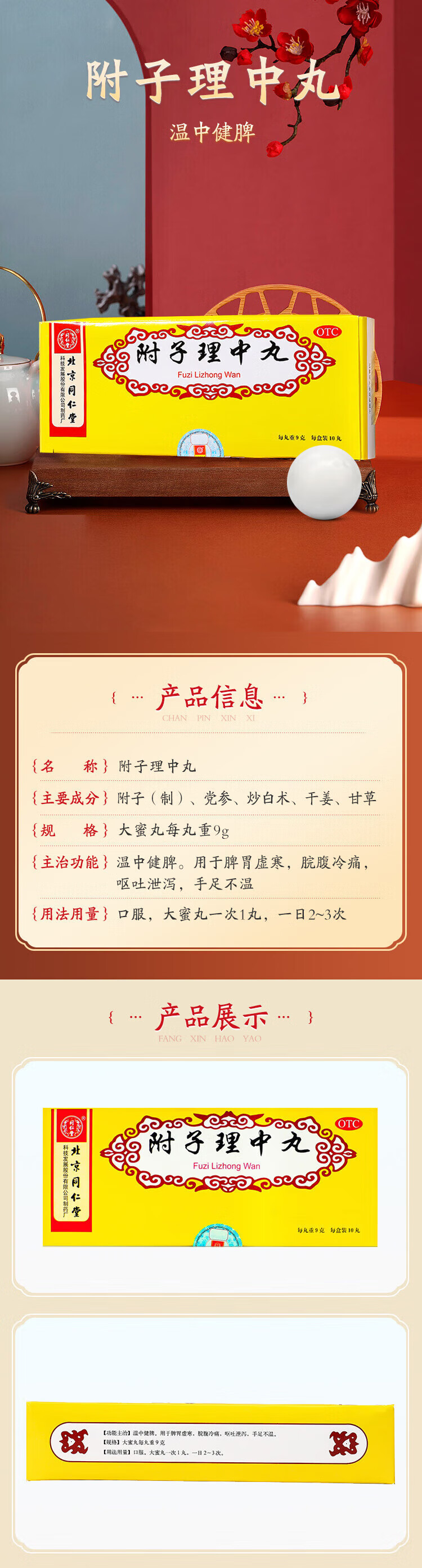 同仁堂附子理中丸9g*10丸大蜜丸 温中健脾 脾胃虚寒 脘腹冷痛 呕吐泄泻 手足不温
