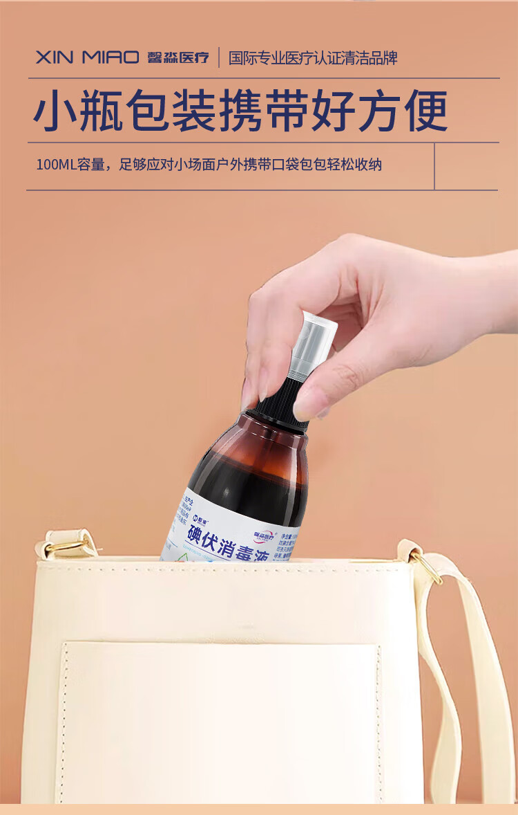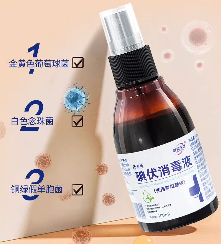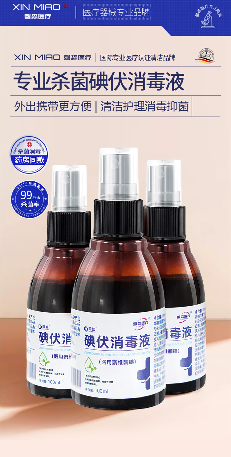 馨淼医疗医用碘伏消毒液碘酒100ml消毒液家用皮肤消毒伤口灭菌喷雾小瓶 【买2送1】碘伏消毒液3瓶装