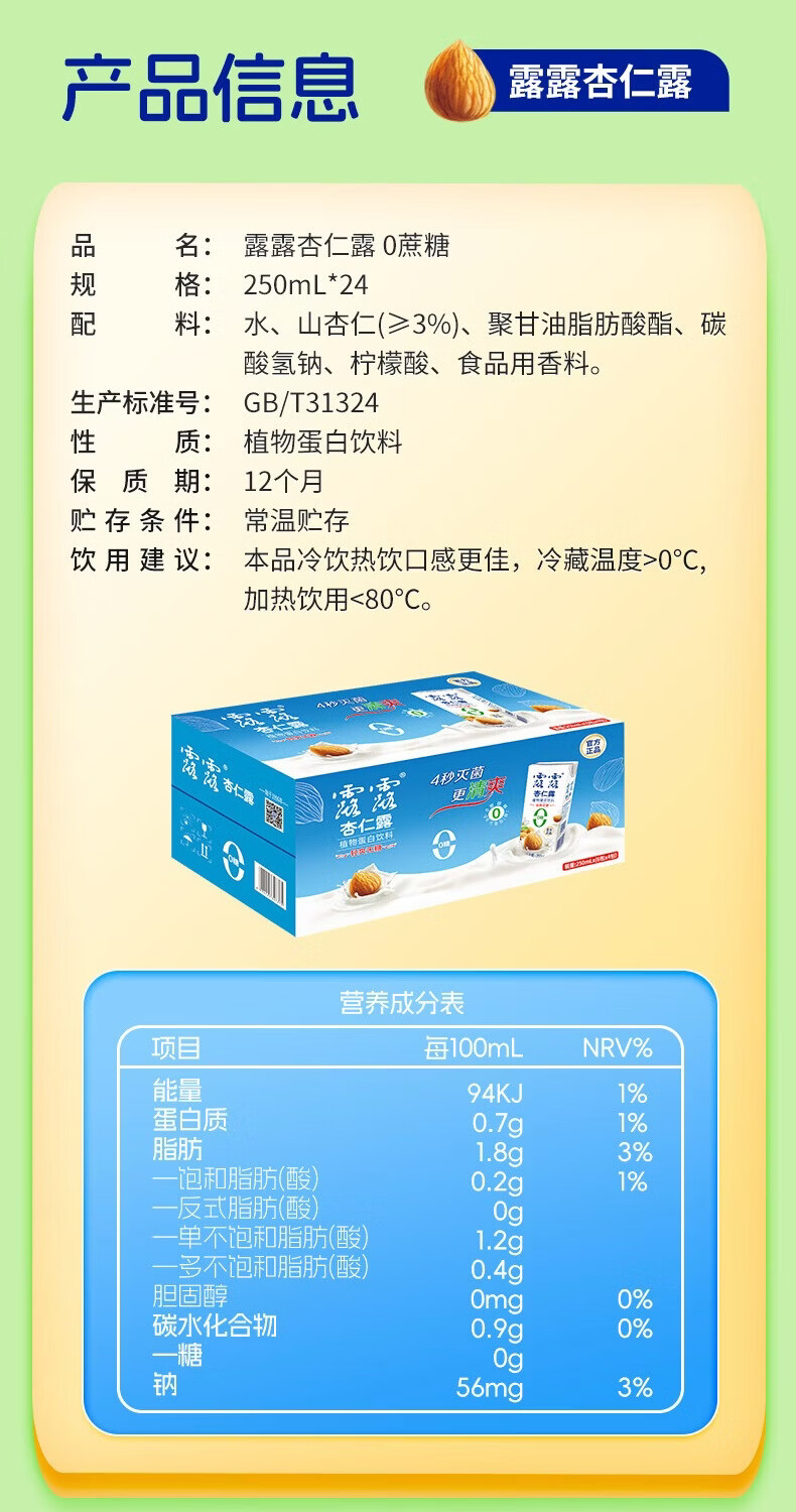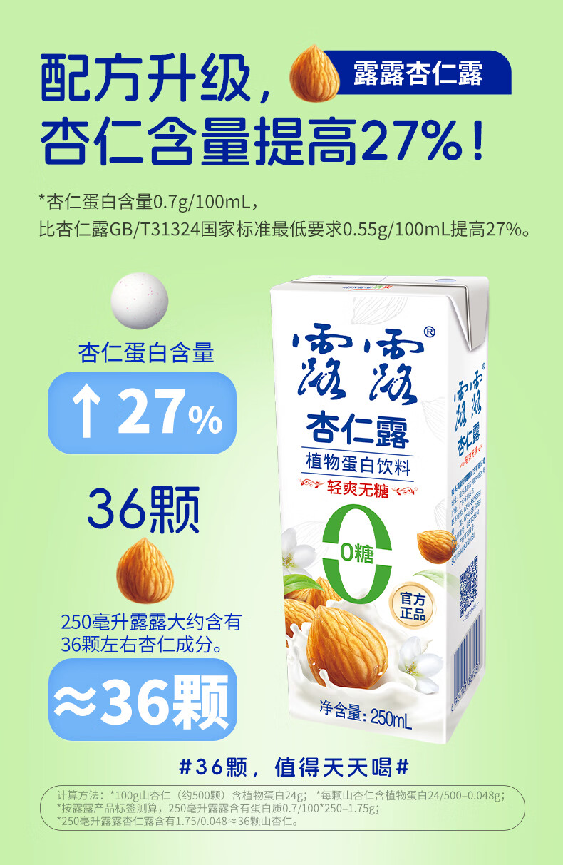 露露0糖杏仁露250mL*24小利乐整箱轻负担0代糖不甜杏仁植物蛋白营养 250mL*24盒