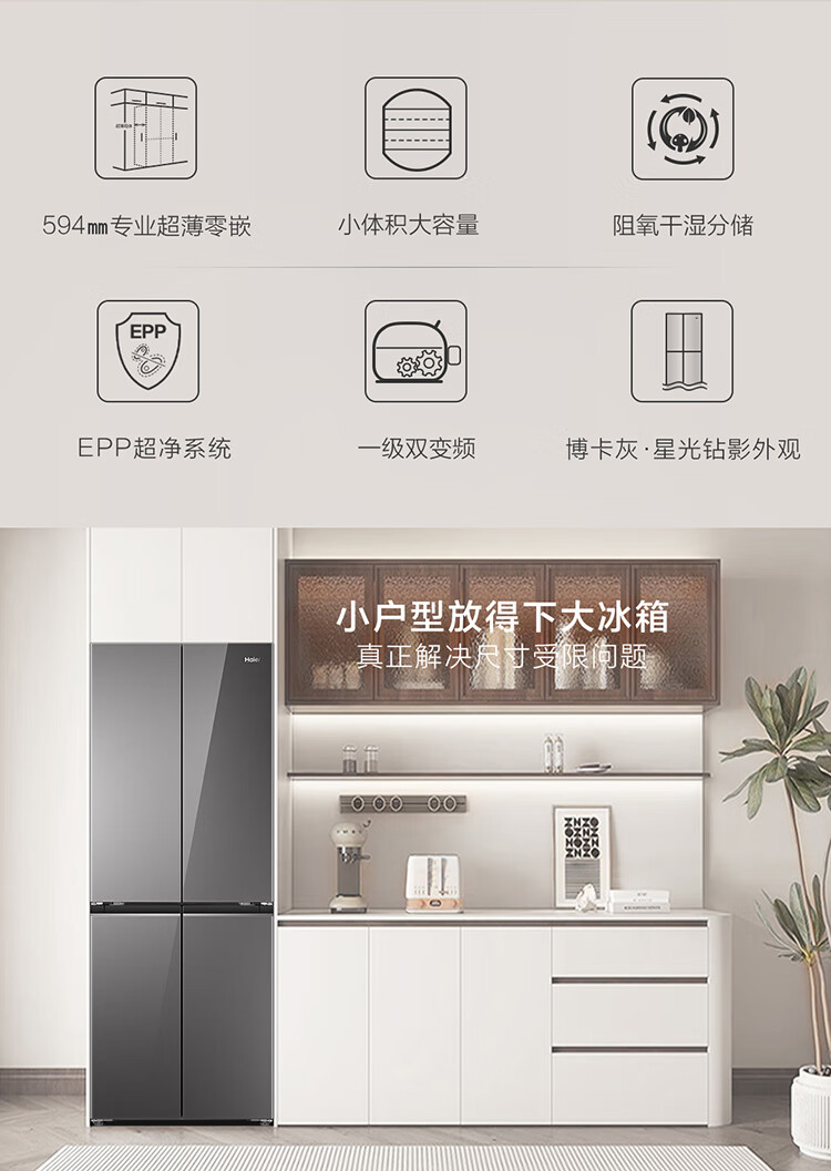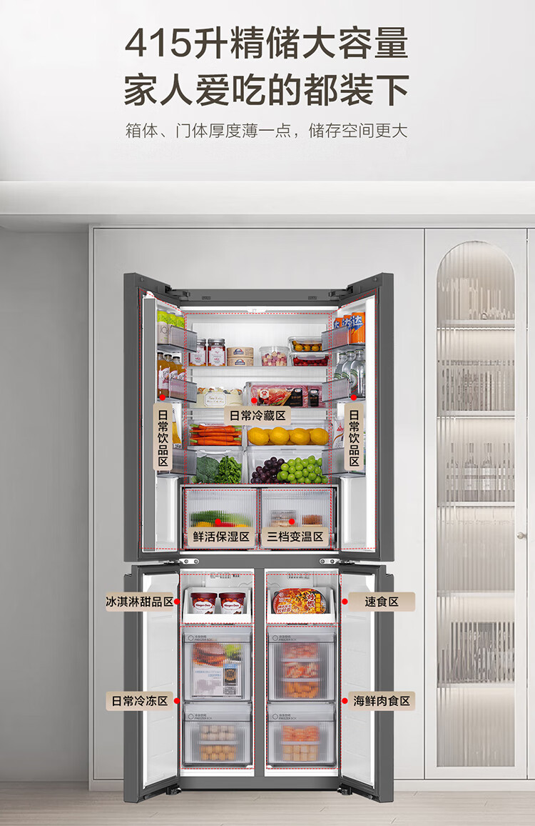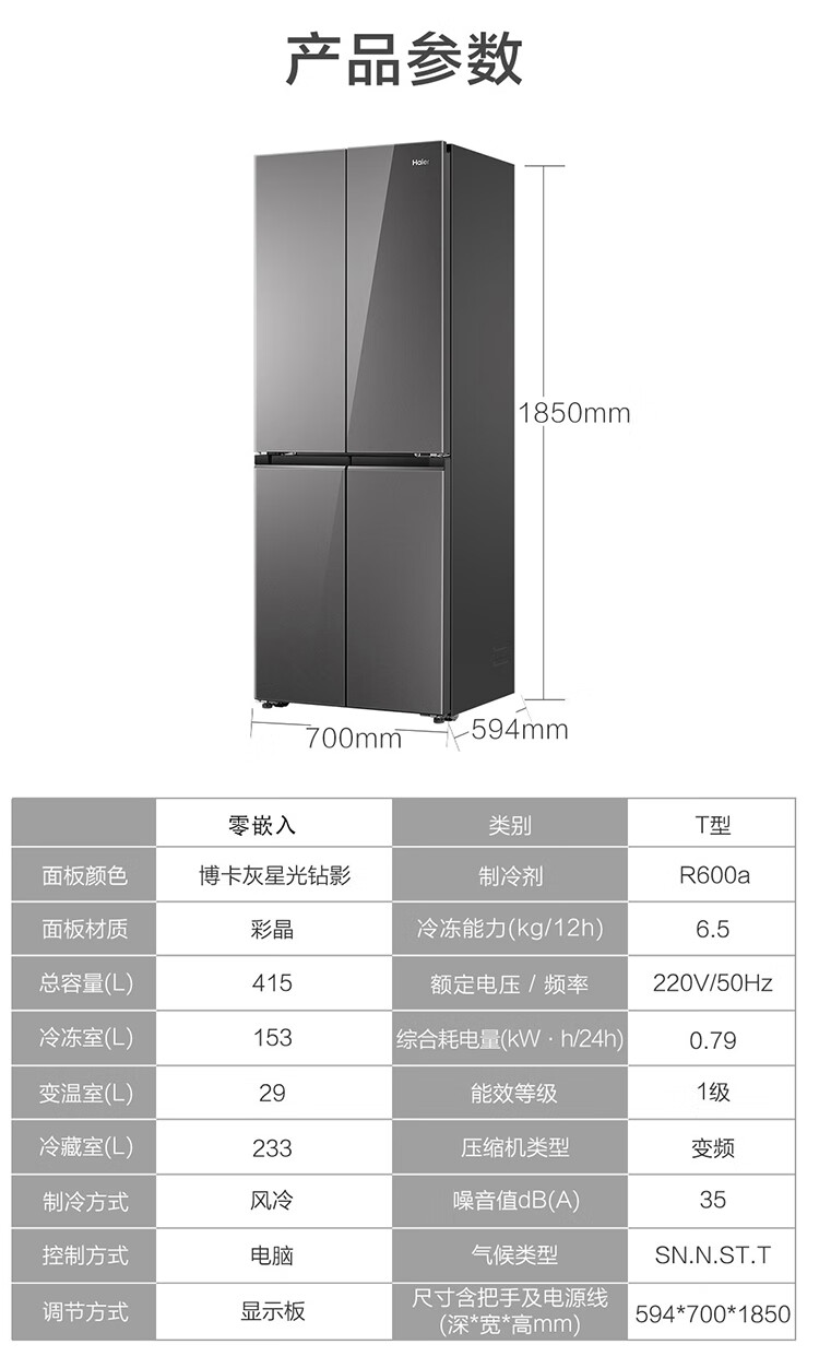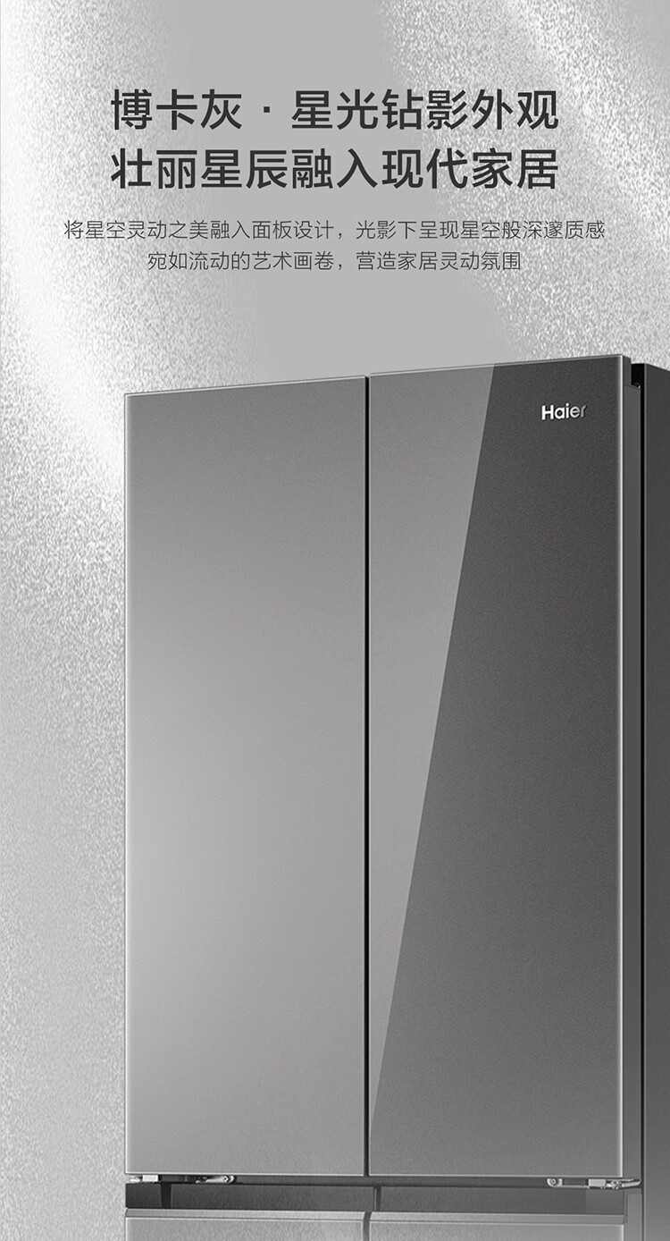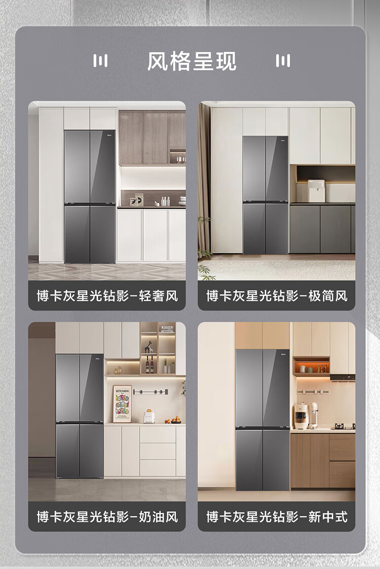 海尔(Haier)和美系列415L十字门冰箱超薄零嵌入宽70厘米一级双变频风冷EPP超净系统冷藏干湿分储技术25年新款 博卡灰+冷藏三档变温+彩晶玻璃面
