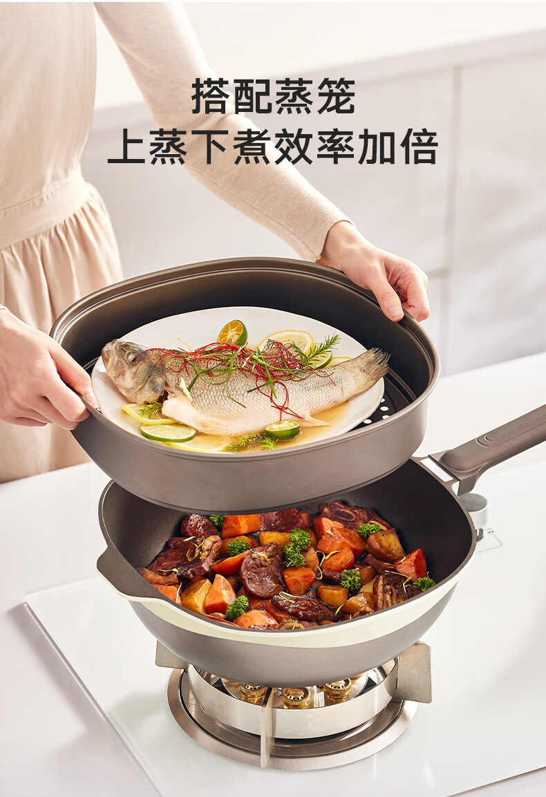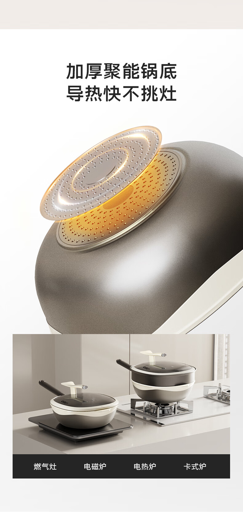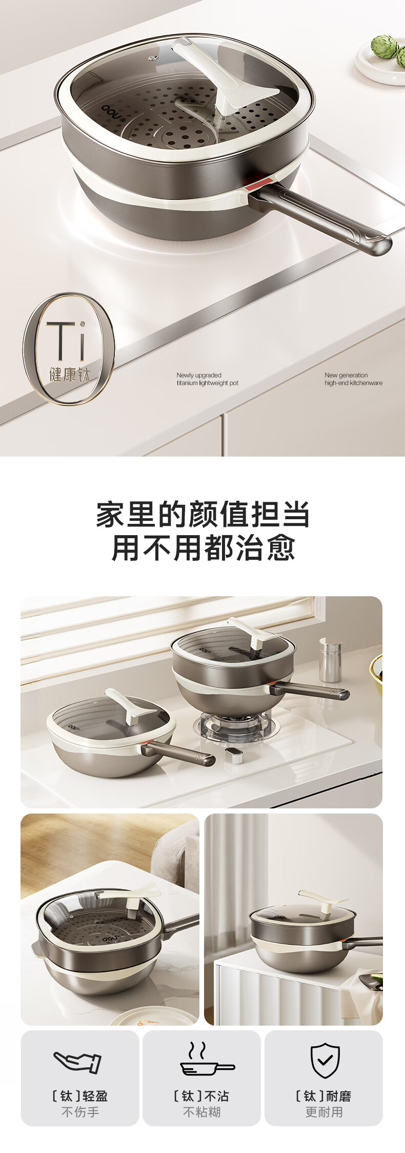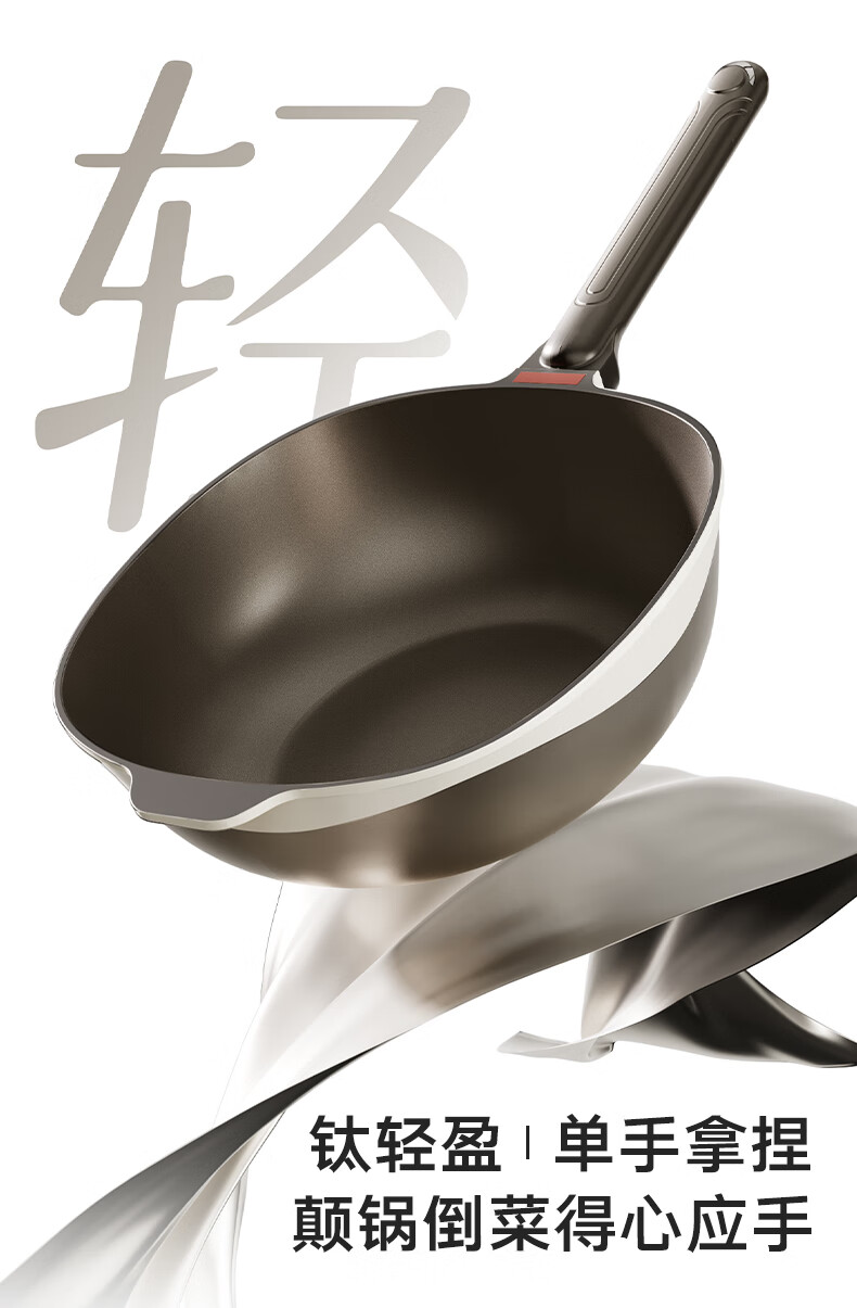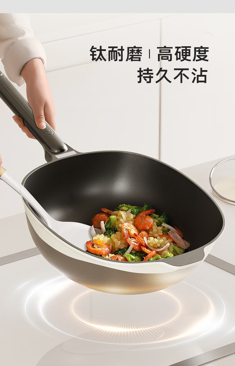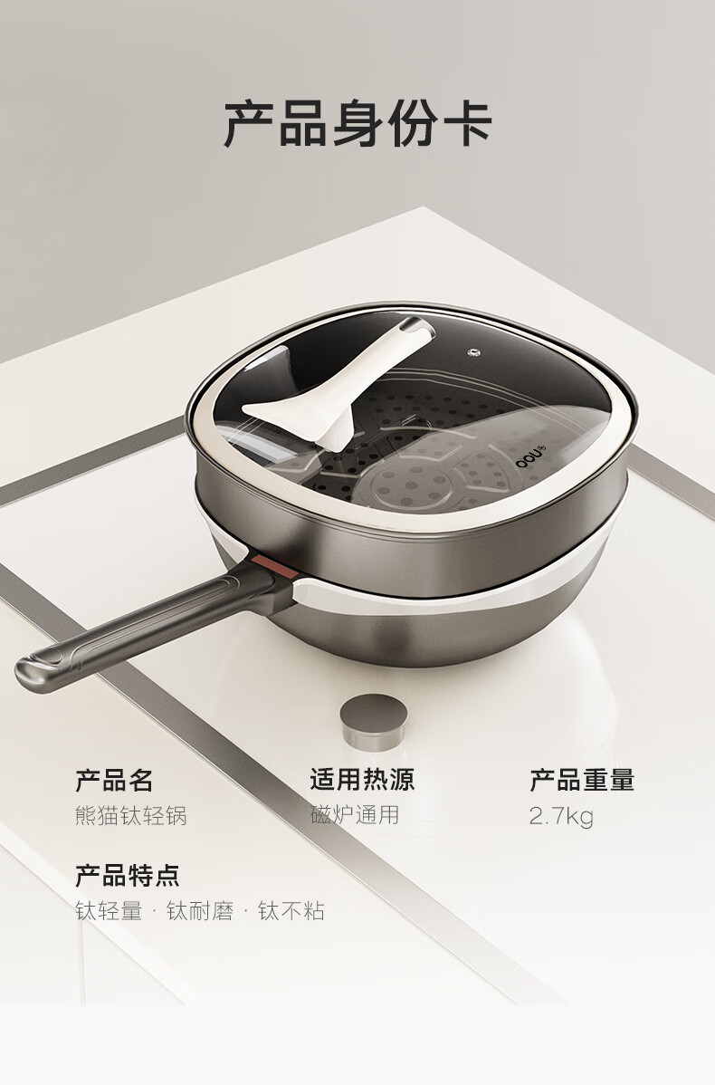 OOU炒锅蒸锅平底锅不粘锅家用炒菜易清洗燃气电磁炉通用钛轻锅 熊猫色|不沾钛轻锅 32cm
