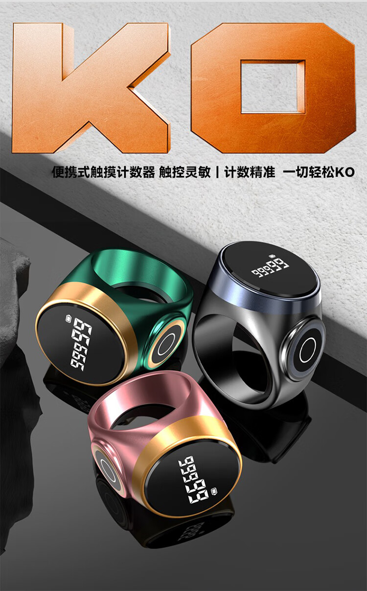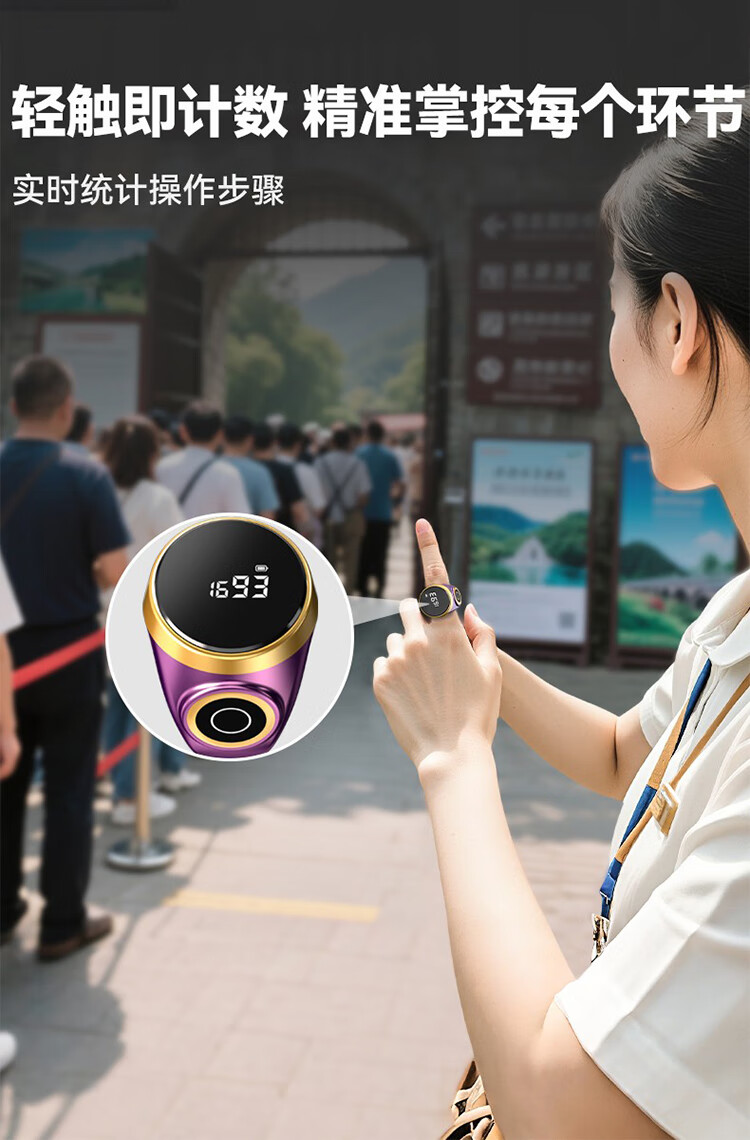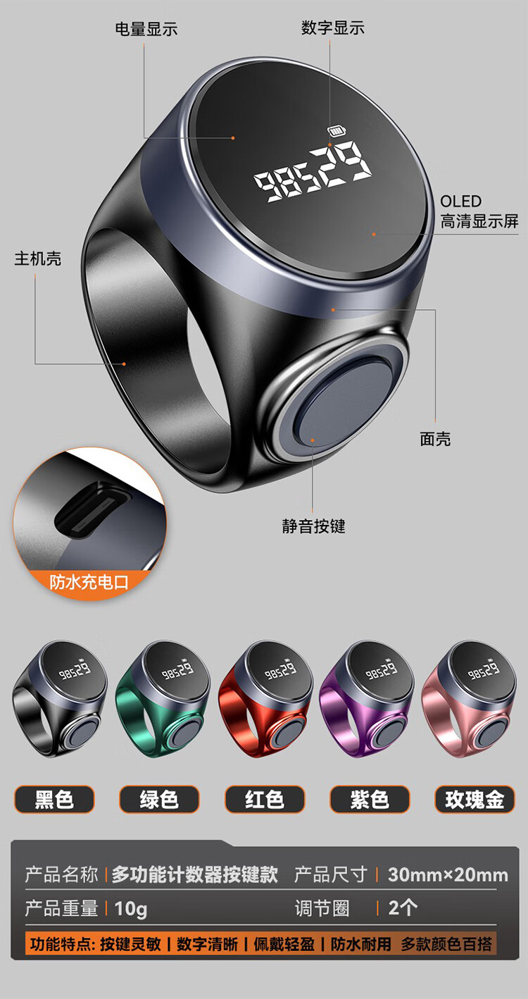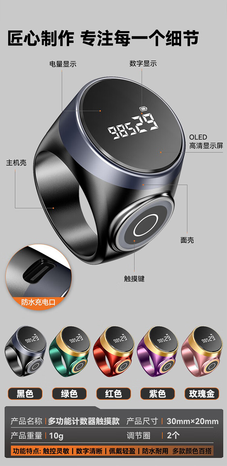 筏芯德国念数计数器新款触摸夜光屏手按戒指充电智能数显手动记数器 触摸款祖母绿