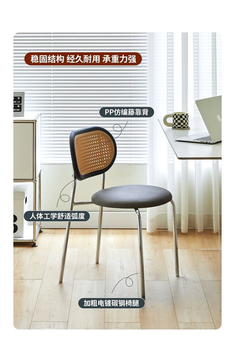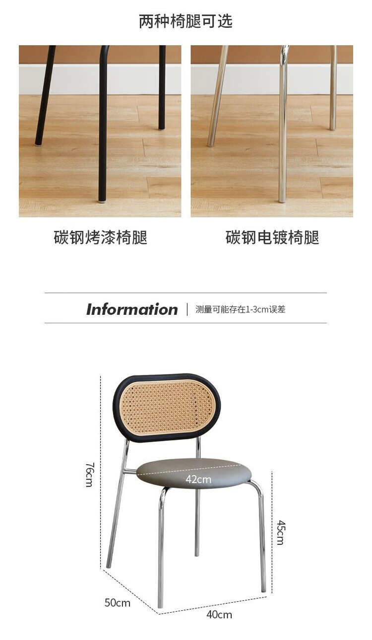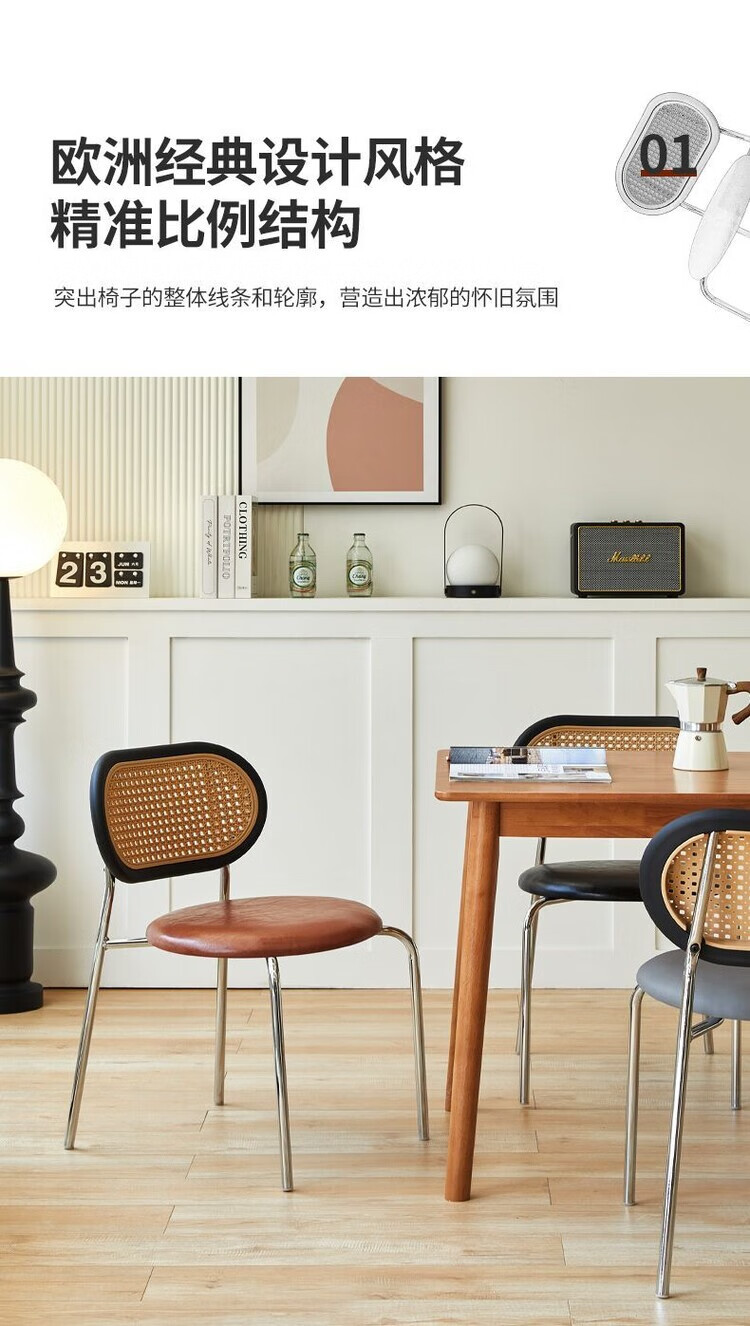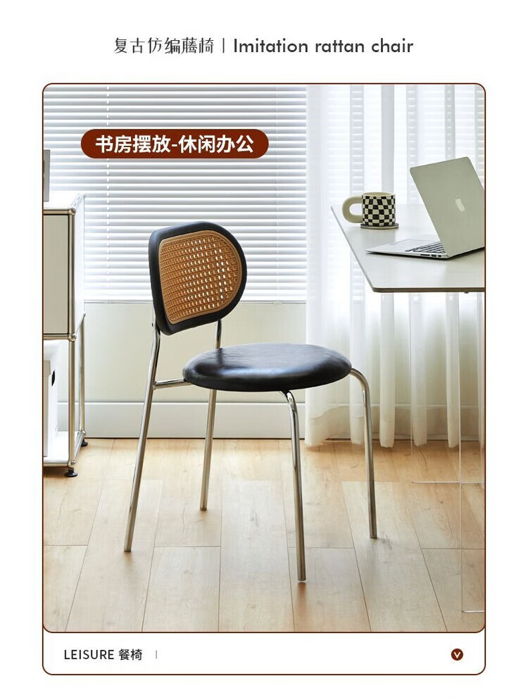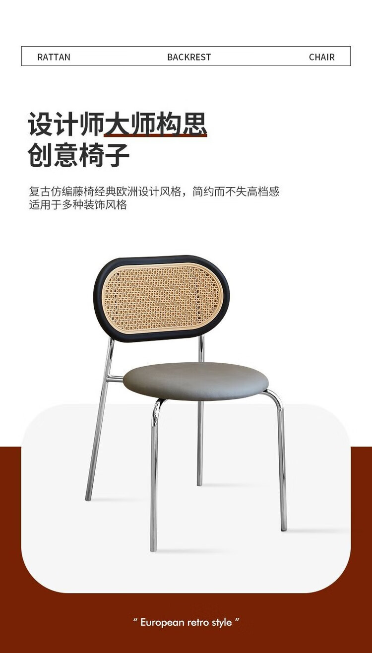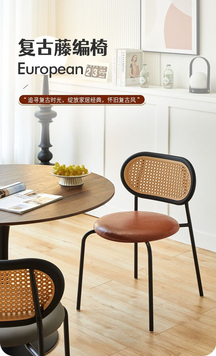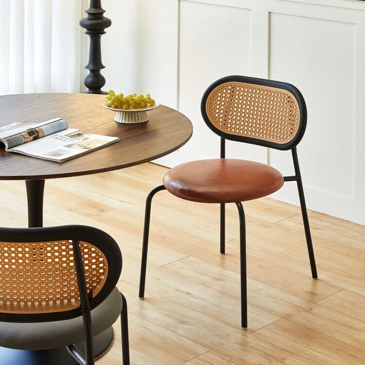 弘星隆北欧奶油网红ins家用中古藤编椅子餐椅简约阳台休闲靠背椅复古 注塑靠背-棕色皮革坐垫-黑色烤漆架