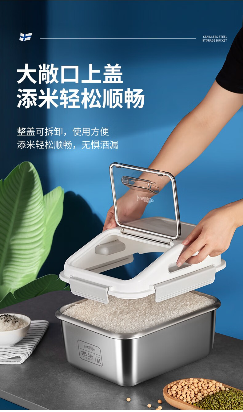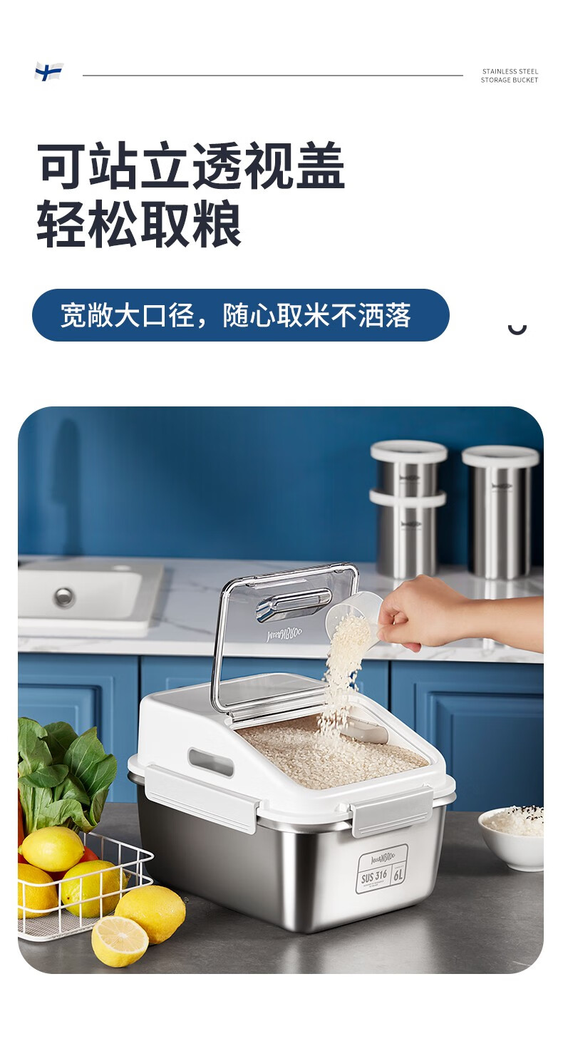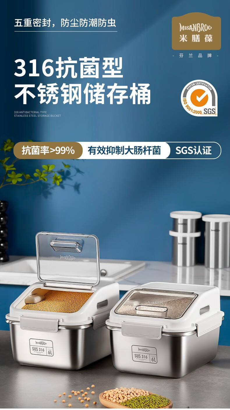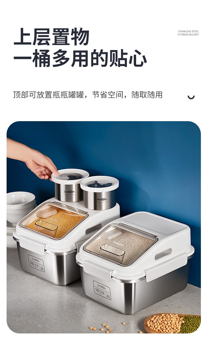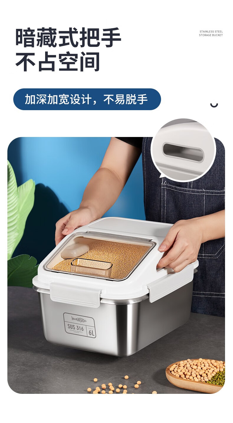 米膳葆米桶316不锈钢装米缸防虫防潮杂粮收纳盒密封粮食桶面粉桶储物罐 316钢储存桶-6L(可装15斤大米)