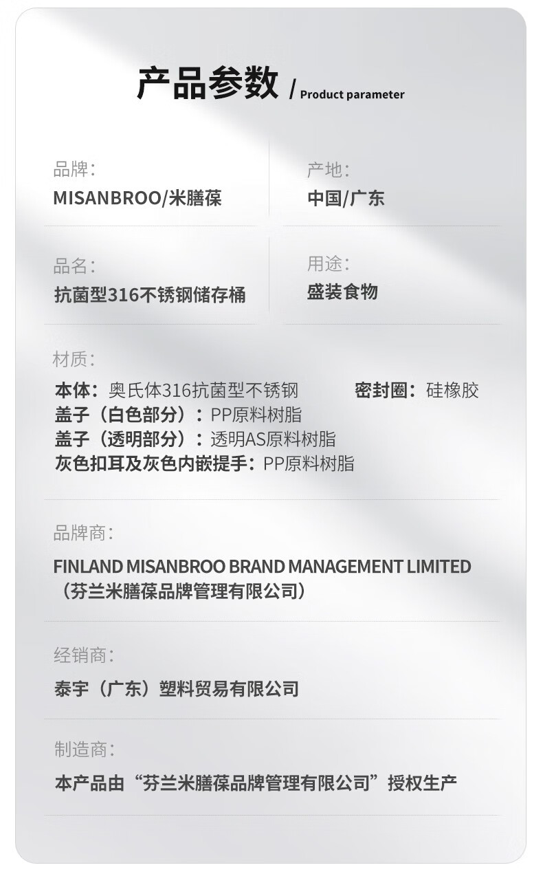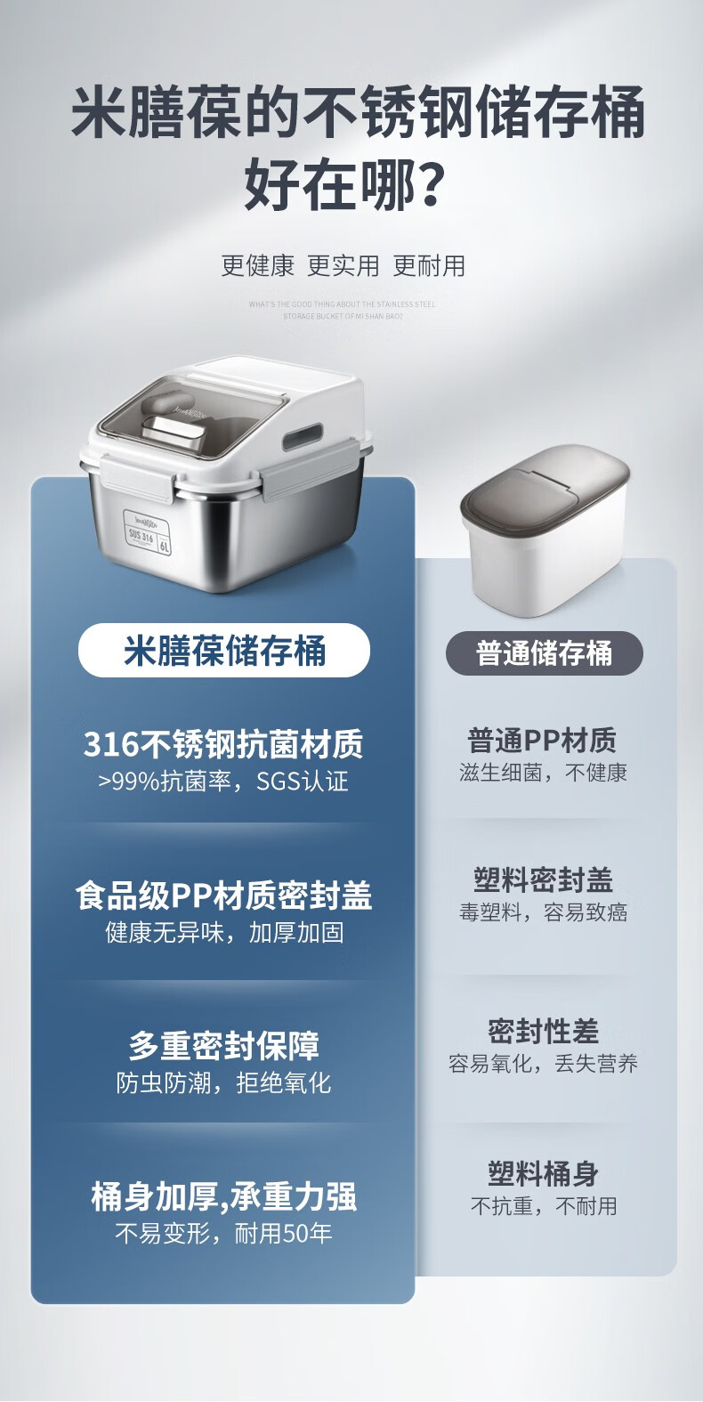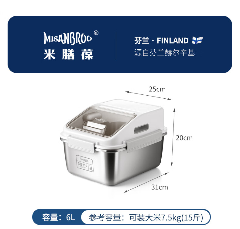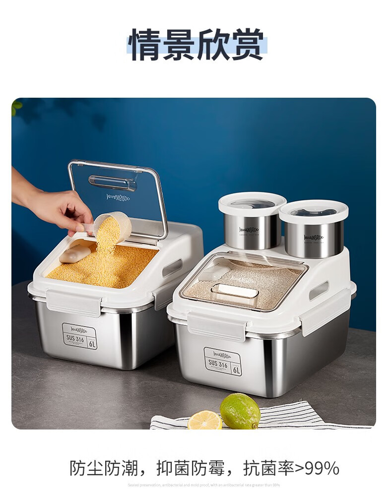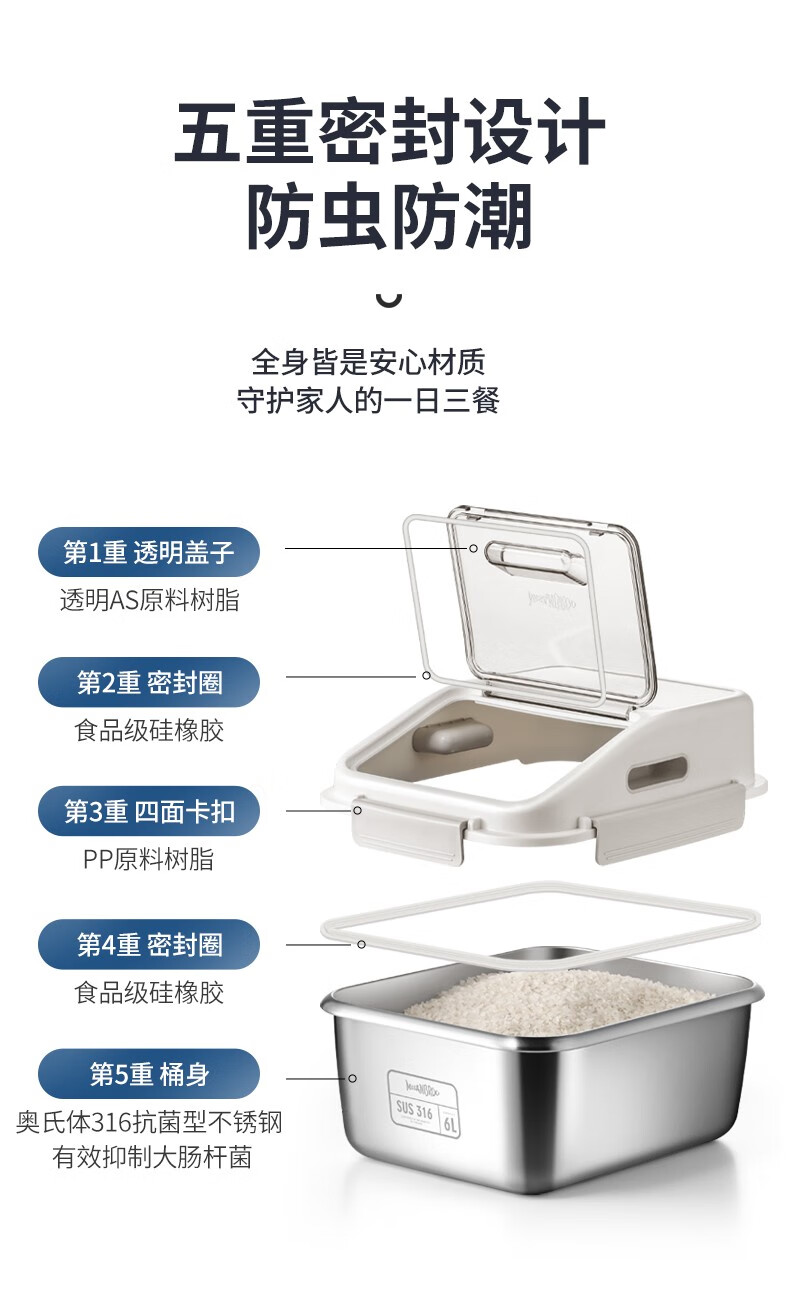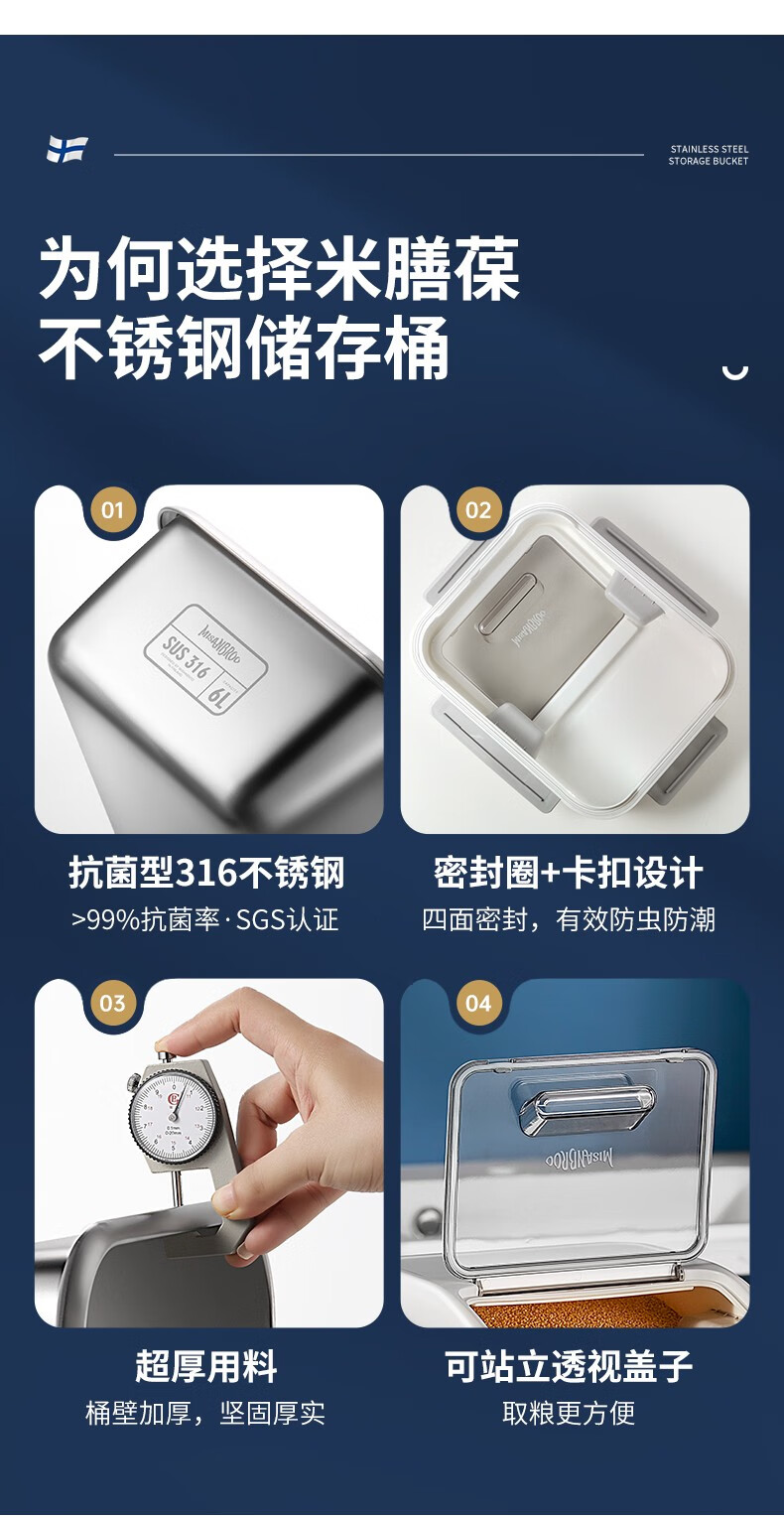 米膳葆米桶316不锈钢装米缸防虫防潮杂粮收纳盒密封粮食桶面粉桶储物罐 316钢储存桶-6L(可装15斤大米)