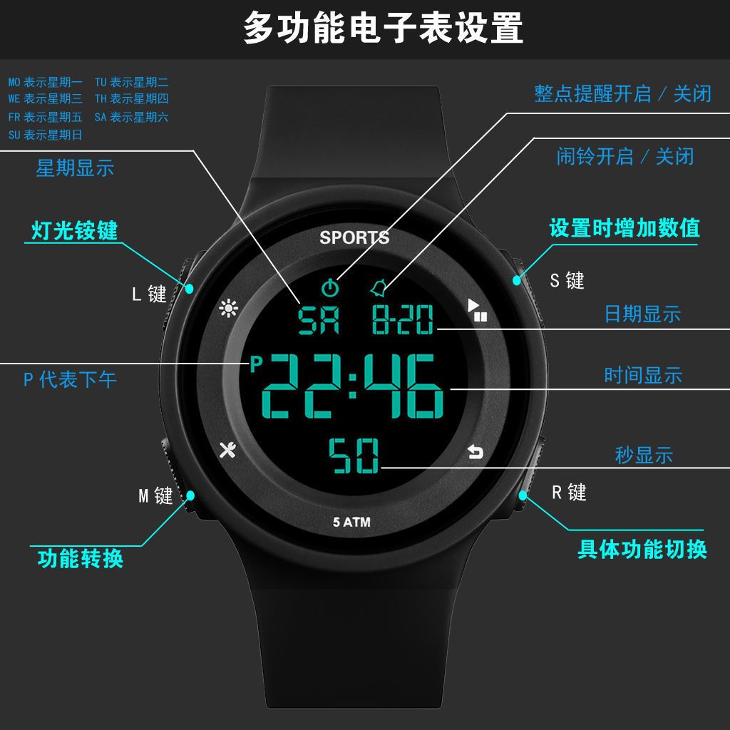 50米防水运动电子手表青少年成人手表男孩夜光中学生男女情侣手表