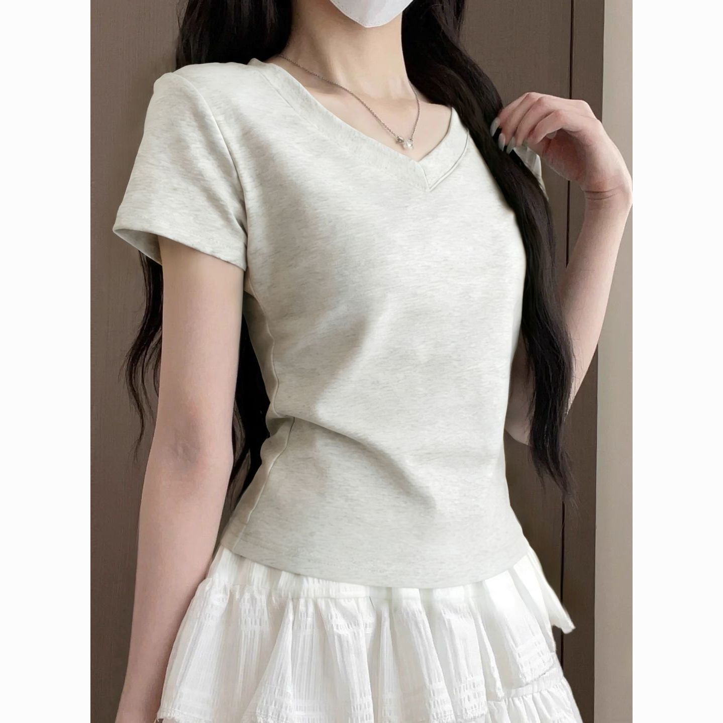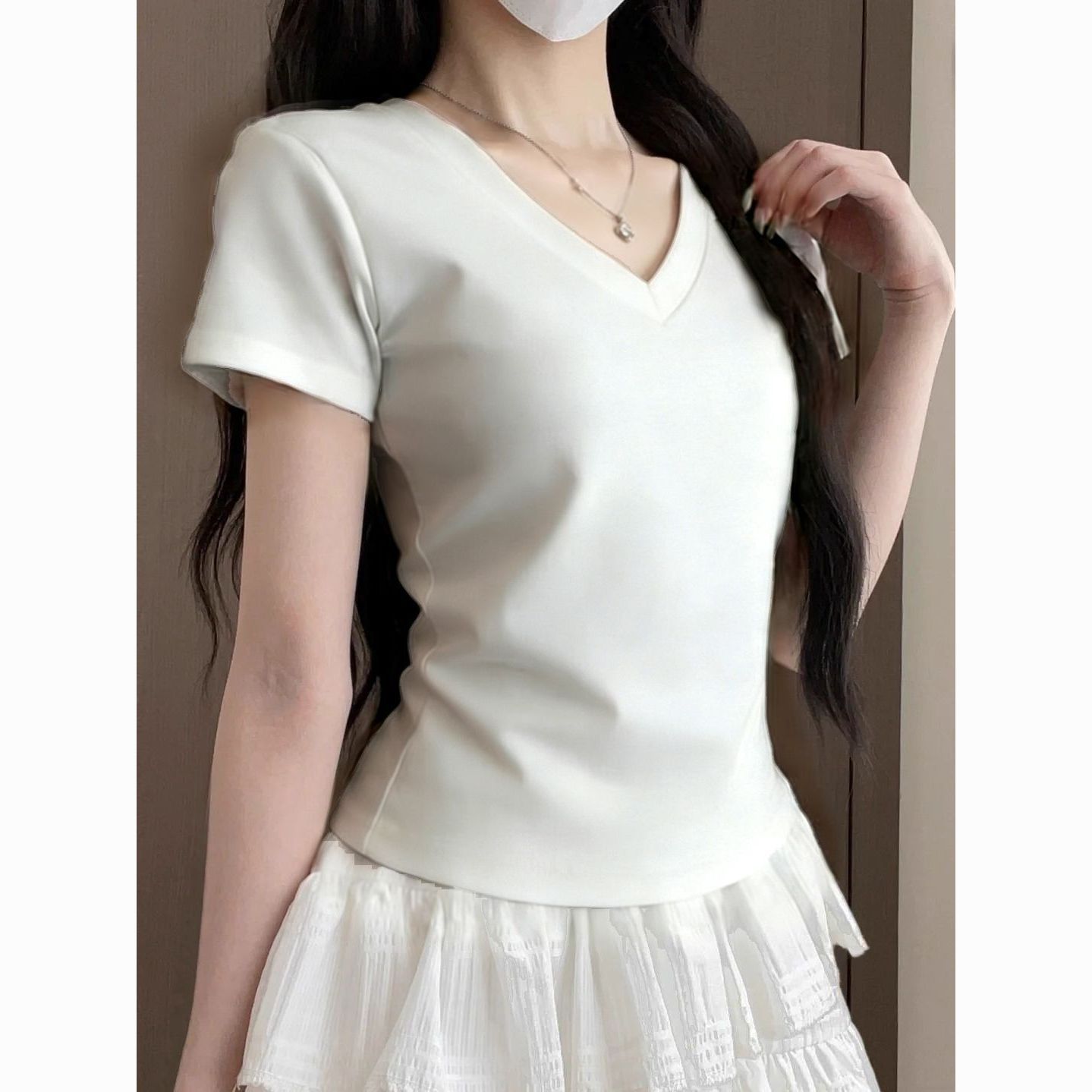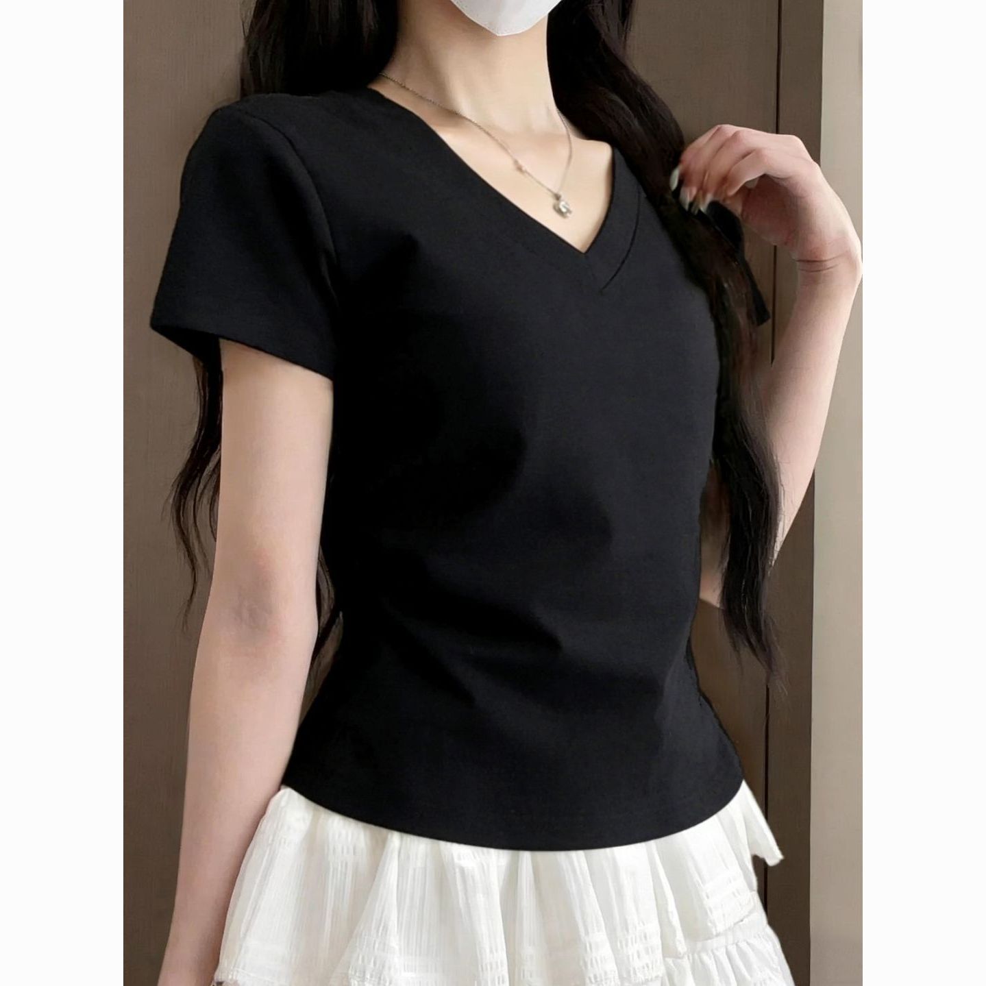 纯棉v领正肩短袖T恤女修身收腰显瘦掐腰上衣女夏季纯色百搭基础款