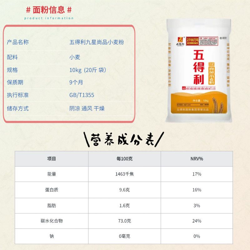 五得利面粉20斤九星尚品小麦粉包子油条馒头饺子通用面粉10kg中筋