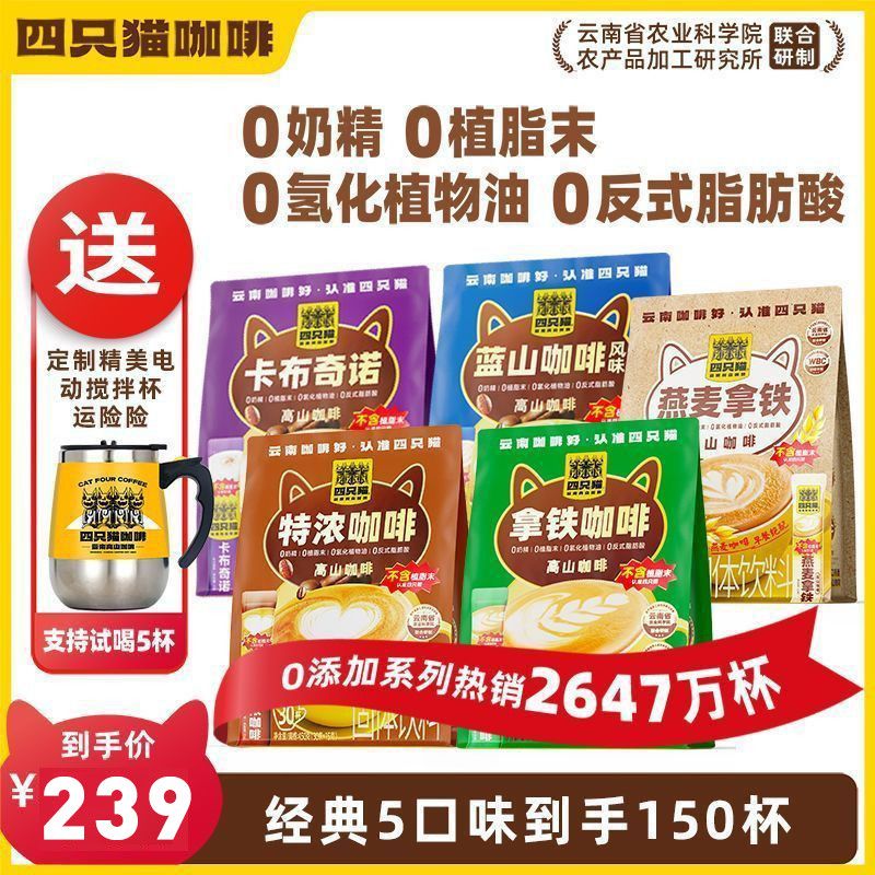 5袋150杯+送搅拌杯】拿铁蓝山特浓卡布燕麦拿铁 四只猫 速溶咖啡