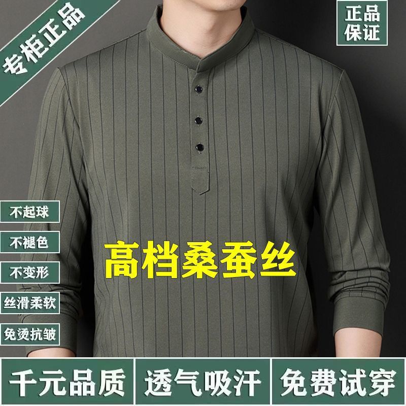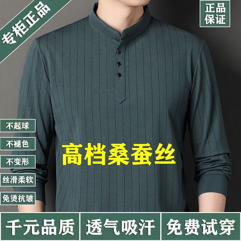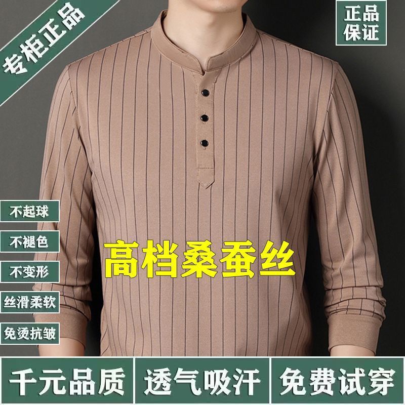正品桑蚕丝长袖t恤男士春秋新款立领条纹时尚打底衫中年百搭上衣