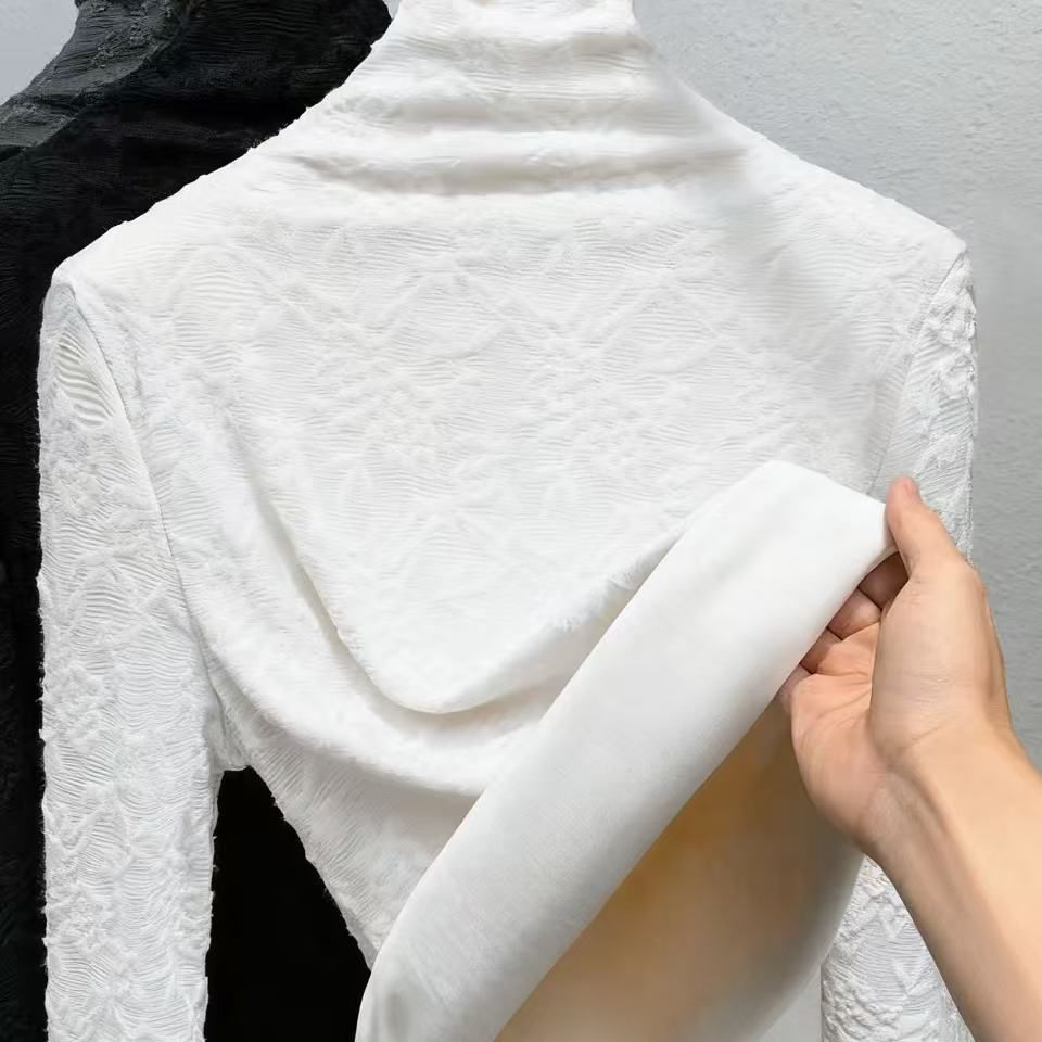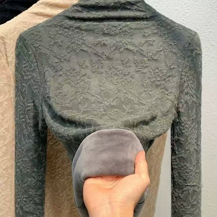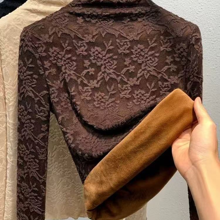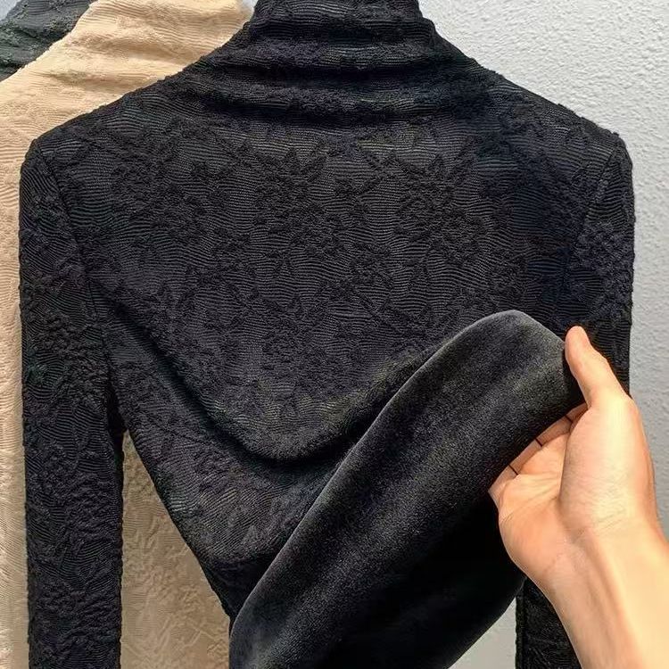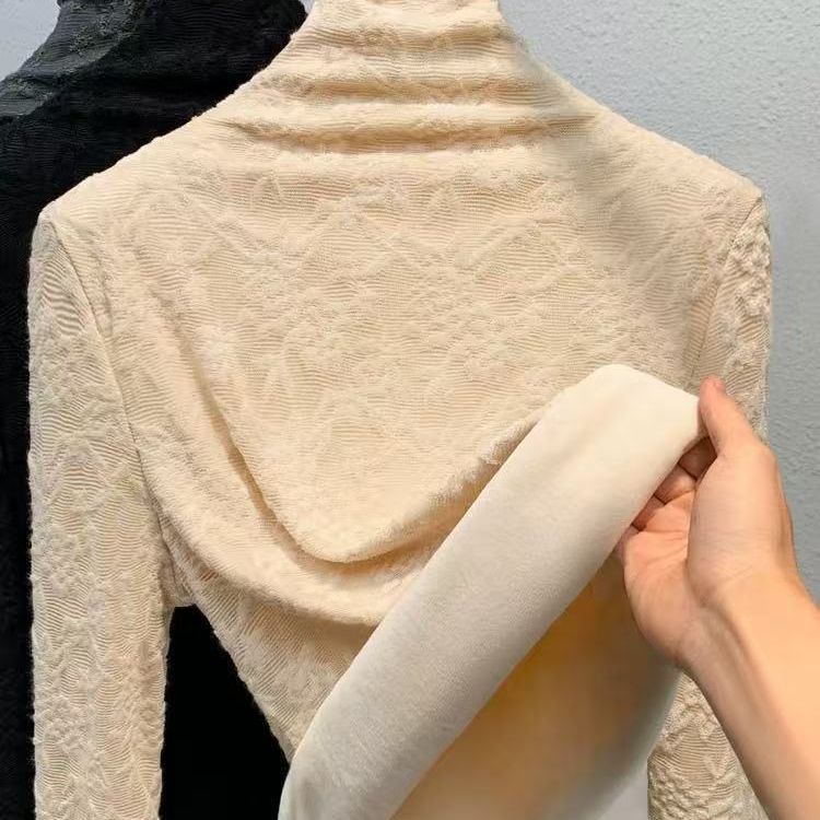 2025新款时尚加绒加厚蕾丝打底洋气长袖秋冬修身保暖高领网纱上衣
